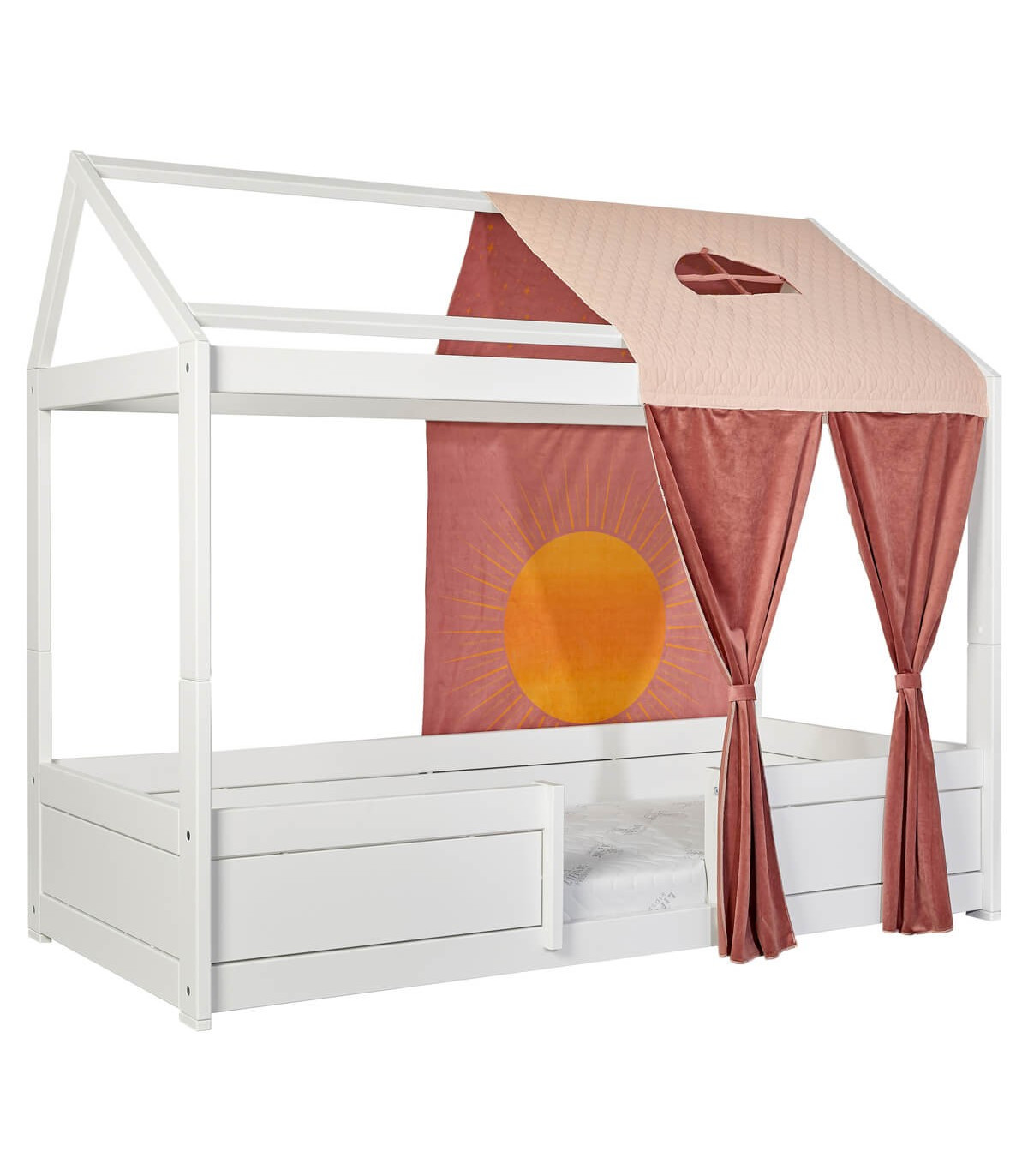 Dieses Bett folgt den Montessori-Prinzipien, ist langlebig und wieder aufbaubar und somit eine nachhaltige Lösung. Die gemütliche Dachabdeckung ist eine optionale Ergänzung.