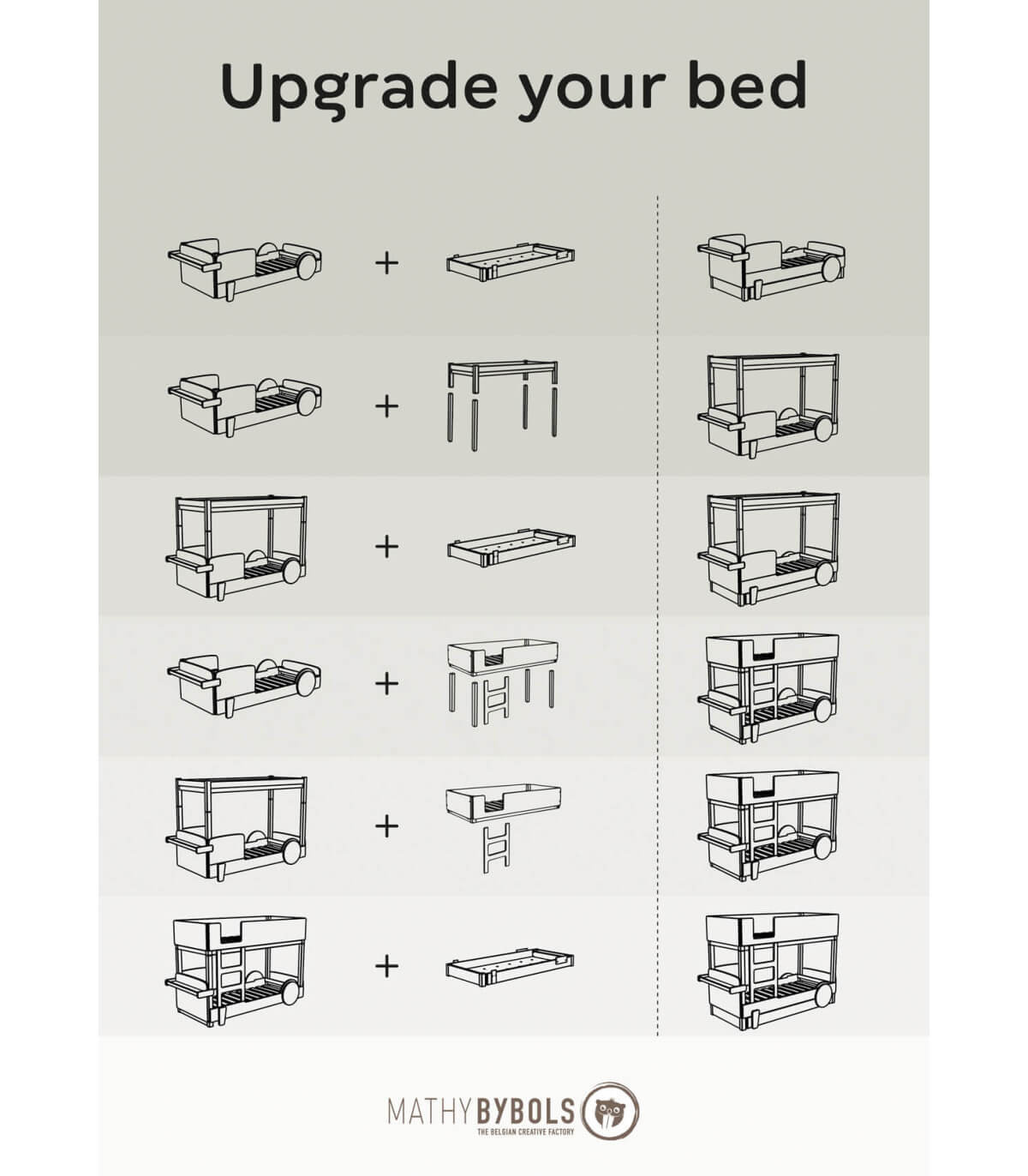 Das Discovery-Bett entwickelt sich weiter und geht mit dem Wachstum des Kindes einher. Vom Cabrio-Bett über das Etagenbett bis hin zum Baldachin - Discovery ist ein mitwachsendes Bett, das sich den Bedürfnissen des Kindes und der Eltern anpasst. Darüber hinaus kann es auf eine eher klassische Höhe angehoben werden und eine Bettschublade aufnehmen. Dieses originelle Modell ermöglicht es dem Kind, auf Entdeckungsreise zu gehen und gleichzeitig seine eigene Welt zu erschaffen. Die Designelemente suggerieren Bewegung, sind aber frei interpretierbar. Das Discovery-Bett kann ebenso gut mit einem Fortbewegungsmittel in Verbindung gebracht werden wie mit dem Stand des Straßenhändlers oder des Eisverkäufers. Alle Träume sind erlaubt ...