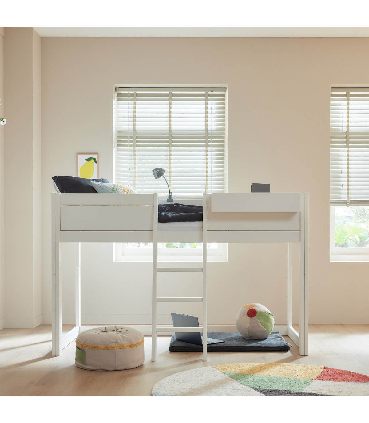 Wenn das Bett zum Mittelpunkt des Spiels wird, verwandeln Sie es im Handumdrehen in ein halbhohes Bett. Der zusätzliche Raum darunter schafft eine erweiterte Spielzone. Gestalten Sie diesen Bereich ganz nach den Wünschen Ihres Kindes – mit einer Spielmatratze, cleveren Aufbewahrungslösungen, Bücherregalen oder einem verspielten Spielvorhang.