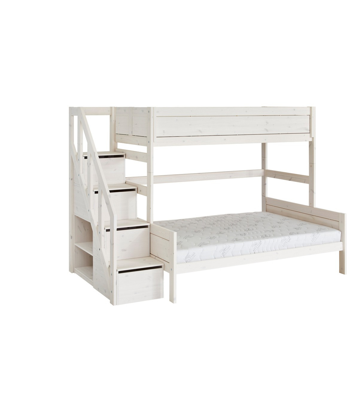 Das klassische Etagenbett liefert Schlafplatz für 2 Personen, wie man es kennt. Hier ist das untere Bett etwas grösser. Die Treppe an der Seite kann links oder rechts angebracht werden und liefert neben einem Platz zum Hochklettern auch noch jede Menge Stauraum.