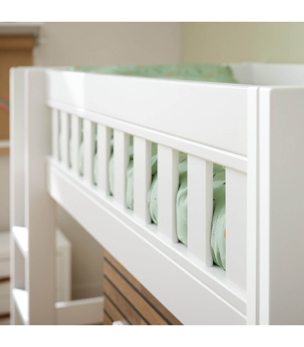 Die Bettseiten mit Holzlatten schaffen eine Offenheit, die Frischeluft an Matratze und Bettbezug lässt und das Kind gleichzeitig vor dem Herausfallen schützt.