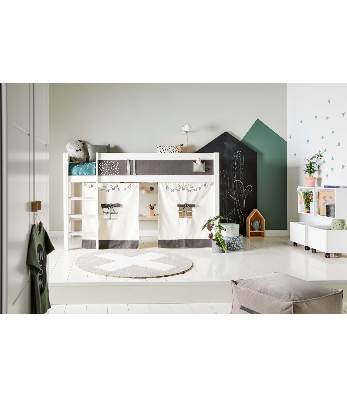 Das halbhohe Bett bietet mit dieser Höhe eine Menge Funktionalität und Platz für viele weitere Anwendungsmöglichkeiten. Unter dem Bett lassen sich lustige Spielvorhänge und Spielmatratzen für verschiedene Bedürfnisse und Geschmäcker integrieren. Die Variante mit der geraden Leiter nimmt natürlich weniger Platz ein als die Variante mit der schrägen Leiter. Auf dem Bett lässt sich auch noch ein Dach des Modells Hideout platzieren, wenn man das Bett in eine Hütte verwandeln möchte.