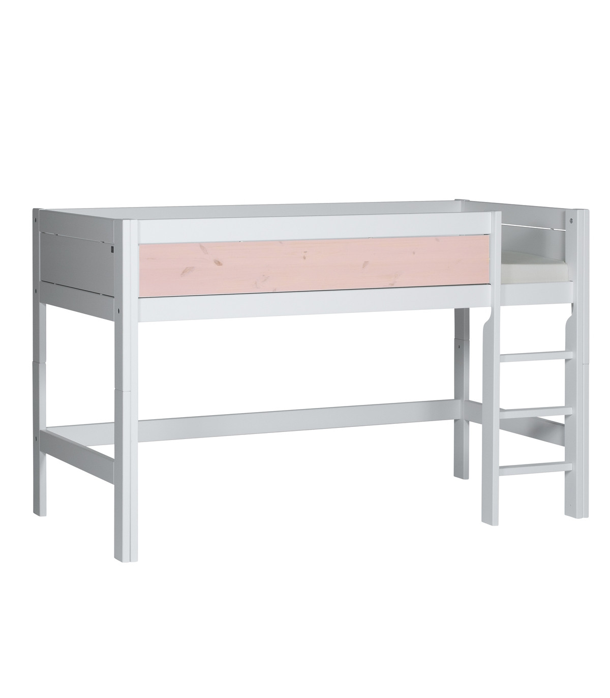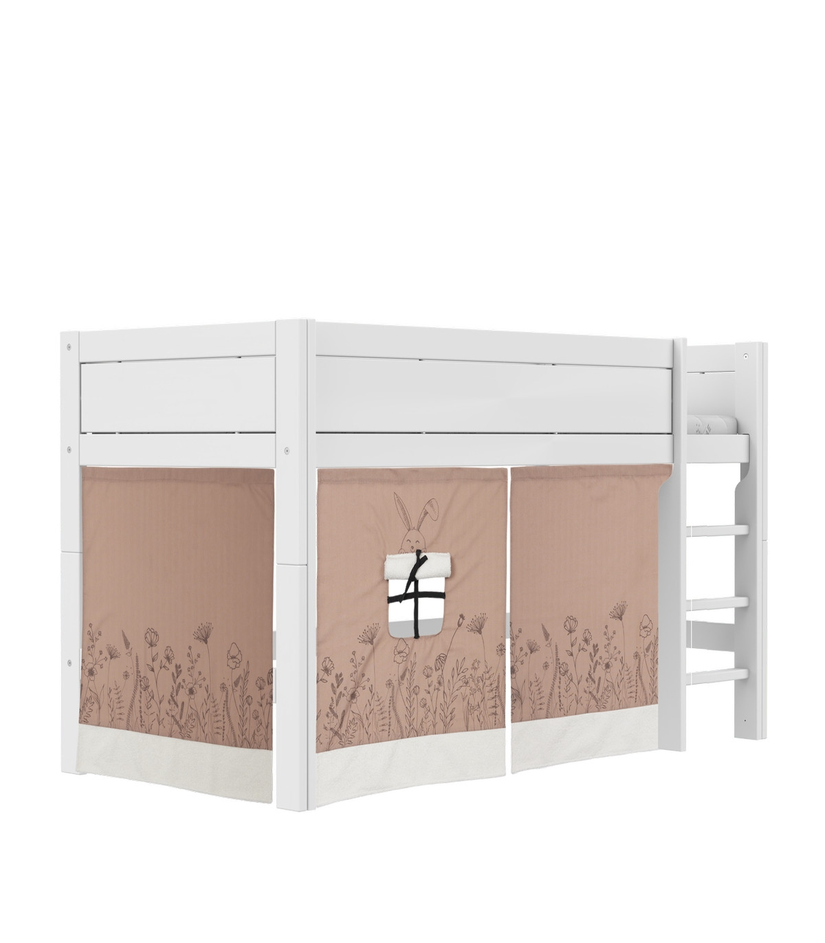 Das halbhohe Bett bietet unter dem Bett viel Platz für Spielraum, Aufbewahrung, Lesen etc. Es bieten sich zu diesem Bett auch eine Reihe von Spielvorhängen an, um eine Höhle darunter entstehen zu lassen. Die gerade Leiter nimmt weniger Platz im Raum ein als die schräge Leiter.
