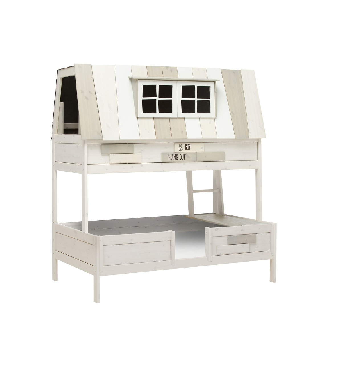 Das aufregende Abenteuerbett My Hangout lädt zu vielen vergnüglichen Stunden ein. Im unteren Bereich das Bett zum Schlafen und oberhalb der Spielboden, der über eine kleine innenliegende Leiter erreicht werden kann, zum Entspannen, Lesen und Aushängen. Kinder ab 3 Jahren sollten schon das Hangout benutzen können. Im oberen Bereich kann die Matratze Art. 7069 (Anthrazit) den Komfort erhöhen. Hier eine Variante, wo das untere Bett ein Matratzenmaß 140 x 200 cm hat. Als Zubehör lässt sich auch von aussen eine Leiter Art. 193 anstellen und man würde den oberen Bereich auch auf diese Weise erreichen können.