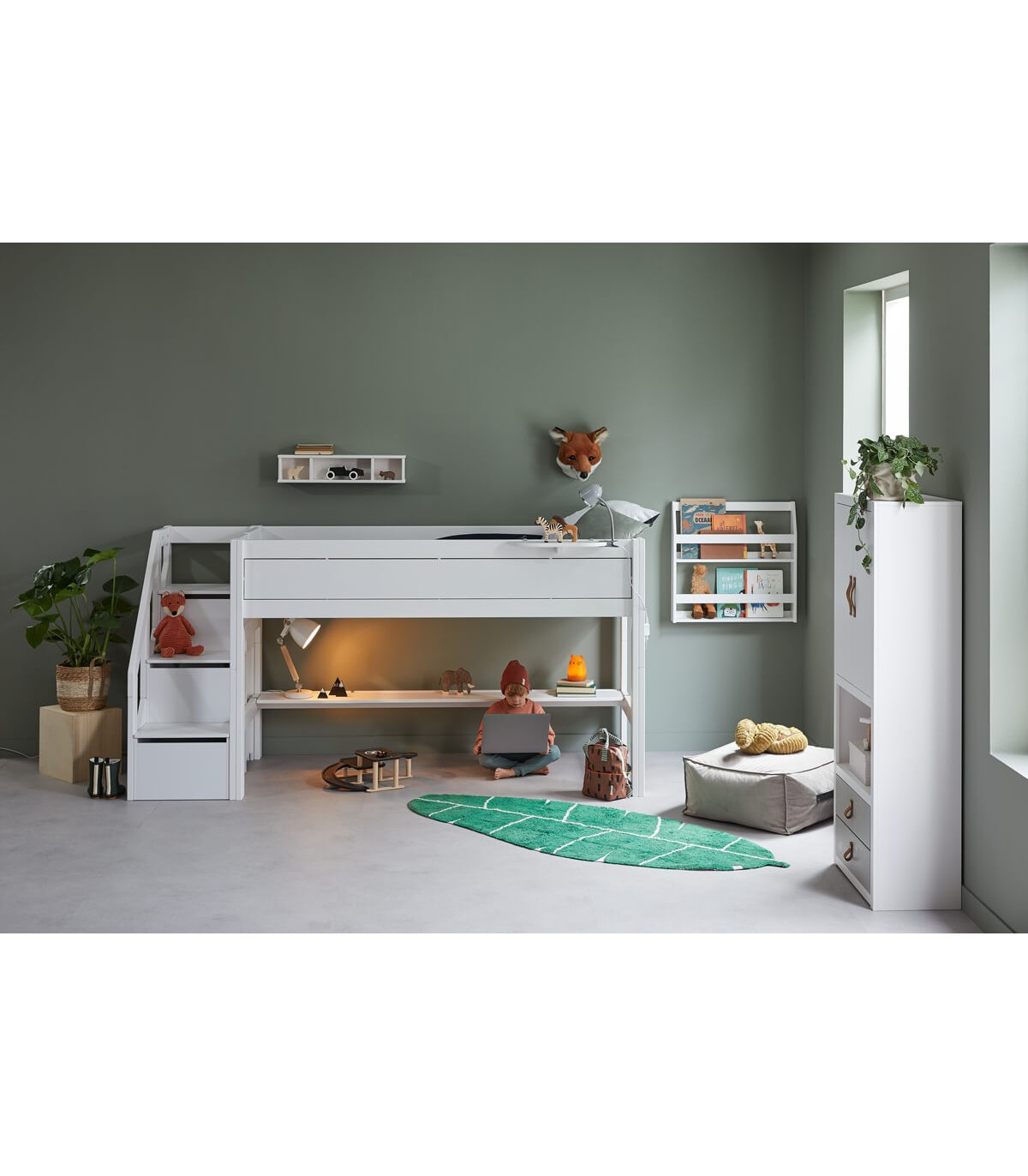 Ein halbhohes Bett ergibt jede Menge Spielplatz unter dem Bett. Die Treppe an der Seite kann links oder rechts angebracht werden und liefert neben einem Platz zum Hochklettern auch noch jede Menge Stauraum.