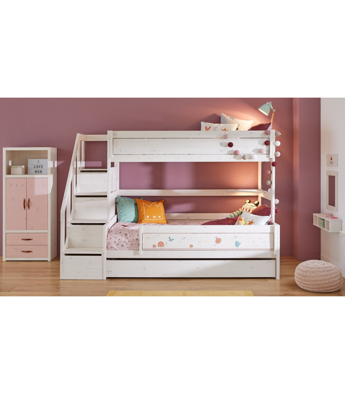Das klassische Etagenbett liefert Schlafplatz für 2 Personen, wie man es kennt. Hier ist das untere Bett etwas grösser. Die Treppe an der Seite kann links oder rechts angebracht werden und liefert neben einem Platz zum Hochklettern auch noch jede Menge Stauraum.