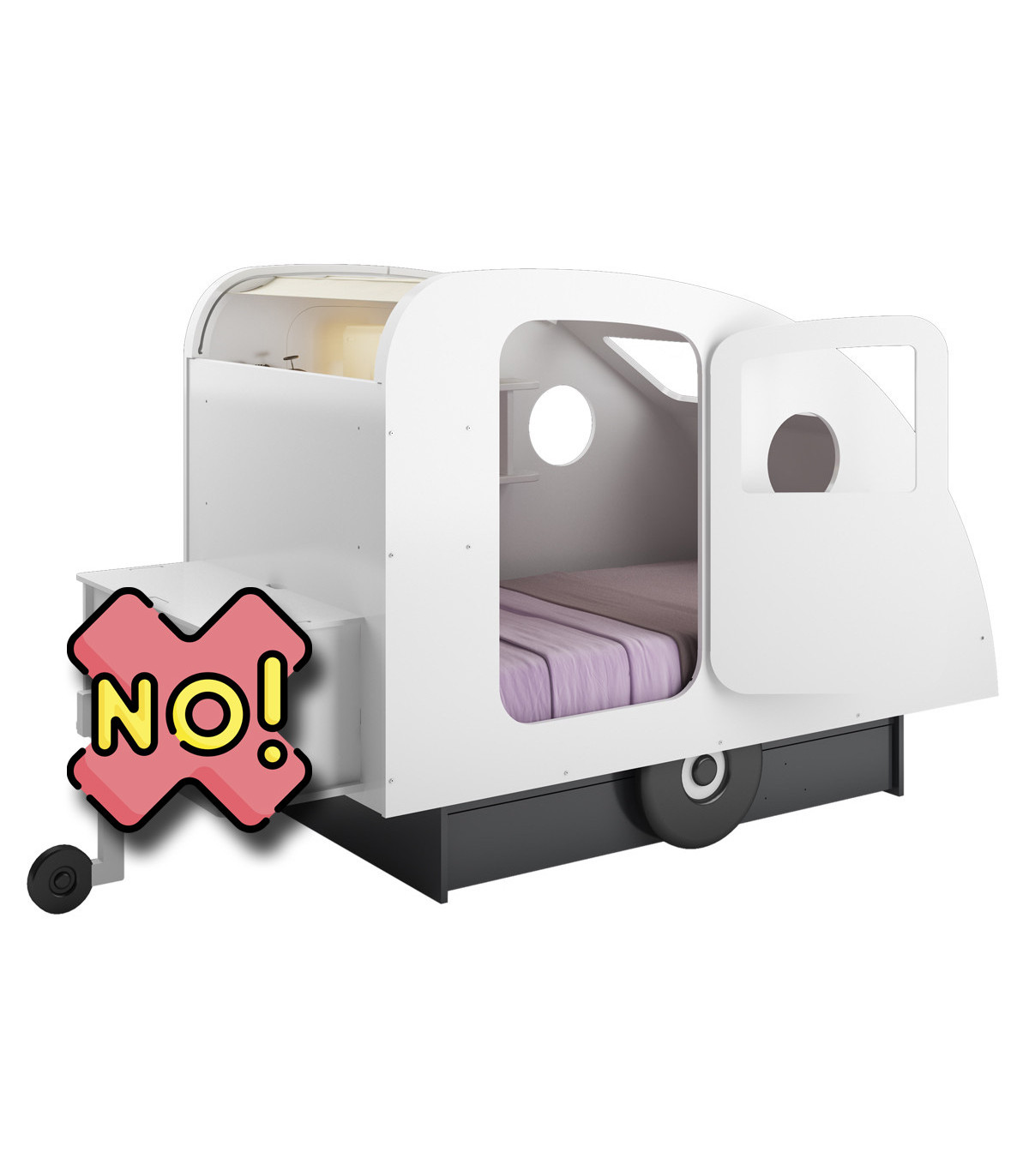 Im Inneren des Wohnwagens befinden sich mehrere Regale, in denen die wichtigsten Utensilien des Kindes aufbewahrt werden. Im Inneren des Wohnwagens befinden sich Truhen für Kuscheltiere oder andere Gegenstände, in denen Sie einfache Gegenstände oder sogar Geheimnisse aufbewahren können. Das Caravan-Bett kann in der Mitte des Raumes stehen und so zwei seitliche Öffnungen haben, oder es kann konventioneller an eine Wand im Zimmer gestellt werden. Der Anhängerraum ist wie eine Spielzeugkiste gestaltet und dient als Stauraum für das Kind. Ausserdem hat das Dach eine Öffnung, sodass das Kind das Dach des Wohnwagens ganz oder teilweise öffnen kann. Es ist auch möglich, das Dach ganz zu schliessen und so einen kokonartigen Raum im Inneren des Bettes zu schaffen. Das Caravan-Bett lädt zum Reisen ein und ermöglicht es dem Kind, seine Fantasie zu entwickeln, indem es in diesem kreativen und originellen Bett seine eigenen Geschichten erschafft. Mit diesem Karawanenbett kann das Kind in seinem Zimmer seine eigene Welt erschaffen. Es kann sich neue Abenteuer ausdenken, träumen, spielen, erfinden, lesen,...