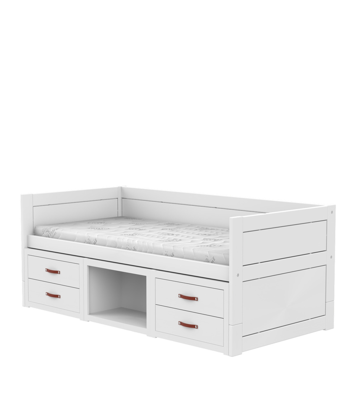 Das Kojenbett ist mit praktischen Regalen ausgestattet, die ideal sind, um Bücher, Spielzeug oder persönliche Schätze ordentlich zu verstauen. Zusätzlich bieten die integrierten Schubladen ausreichend Platz für Kleidung oder andere Utensilien, sodass das Zimmer stets aufgeräumt bleibt. Der robuste Lattenrost sorgt für optimalen Schlafkomfort und unterstützt eine gesunde Schlafposition.