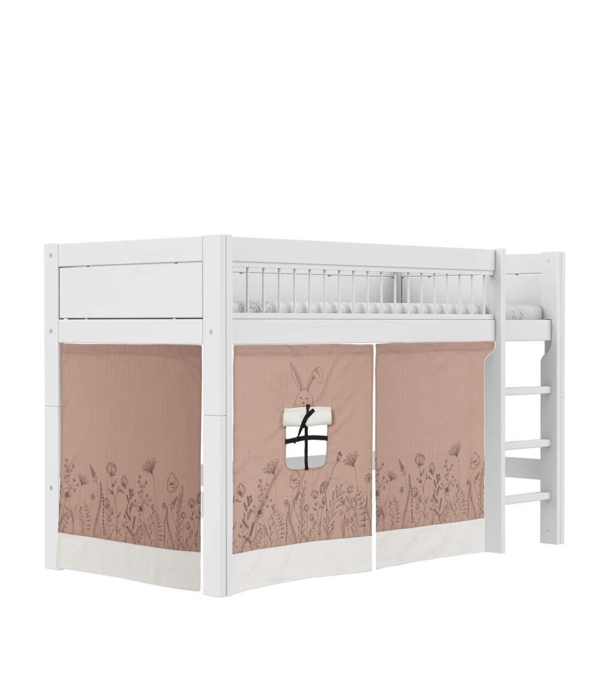 Das halbhohe Bett bietet unter dem Bett viel Platz für Spielraum, Aufbewahrung, Lesen etc. Es bieten sich zu diesem Bett auch eine Reihe von Spielvorhängen an, um eine Höhle darunter entstehen zu lassen. Die gerade Leiter nimmt weniger Platz im Raum ein als die schräge Leiter.