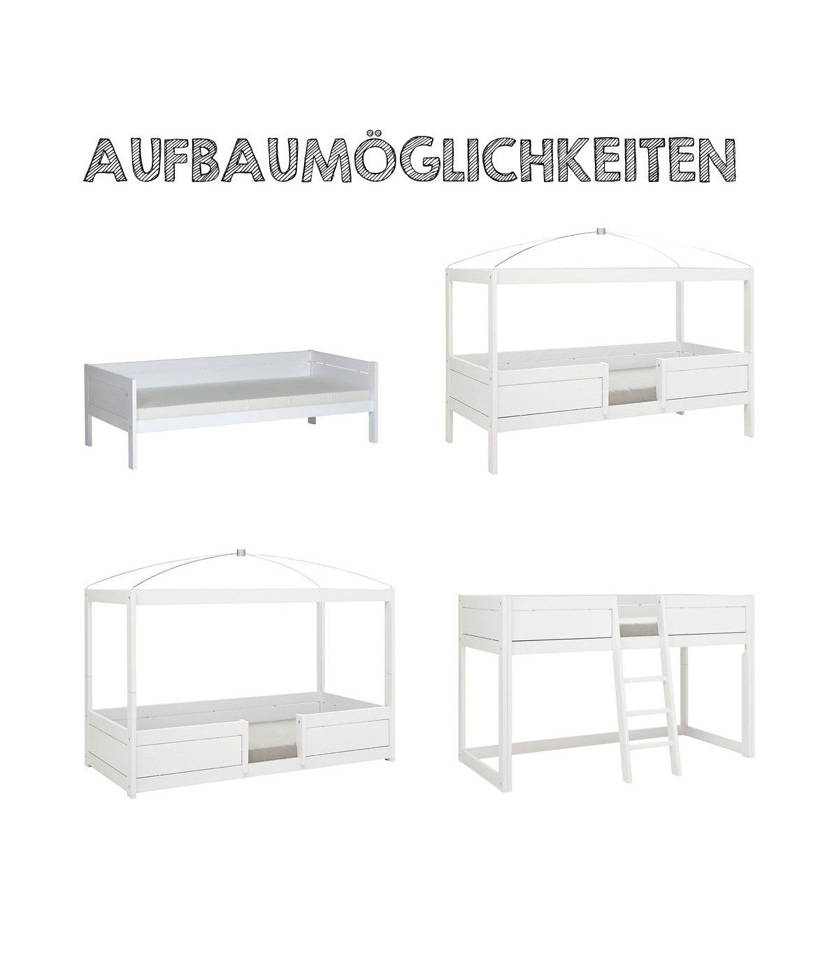 Das 4-in-1 Bett ist ein Konzept, wo man das Bett mit allen Teilen in 4 verschiedenen Versionen aufstellen kann und somit dem Kind vom jungen Alter bis zum jungen Teenageralter anpassen kann.
