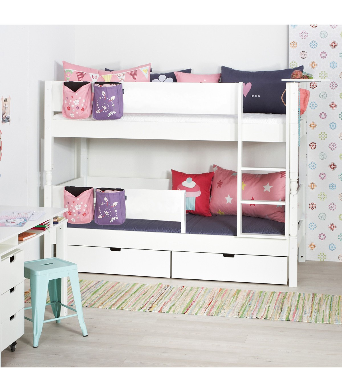Die Leiter kann entweder links oder rechts platziert werden. Dieses Bett passt mit unseren Bettschubladen perfekt zusammen. Wünschst du auch die vorne Absturzsicherung für das Unterbett, kann sie hier gekauft werden.