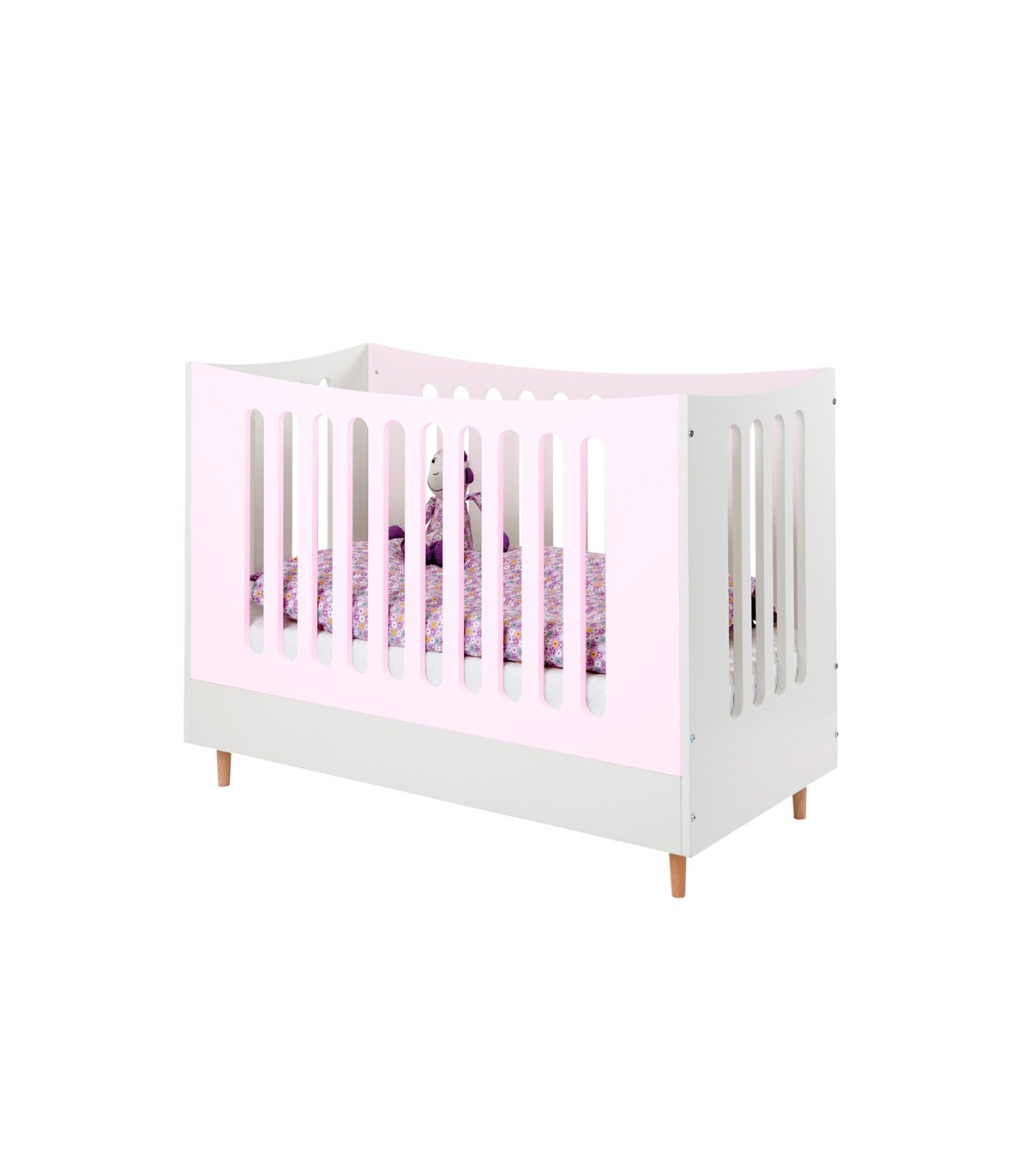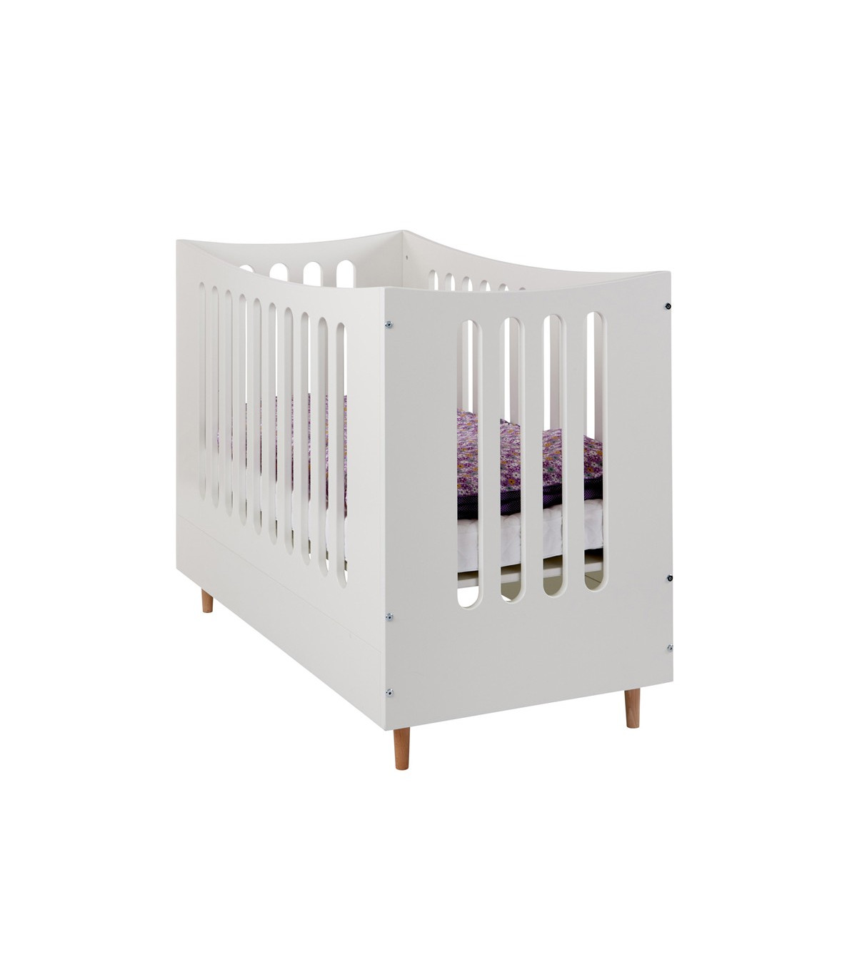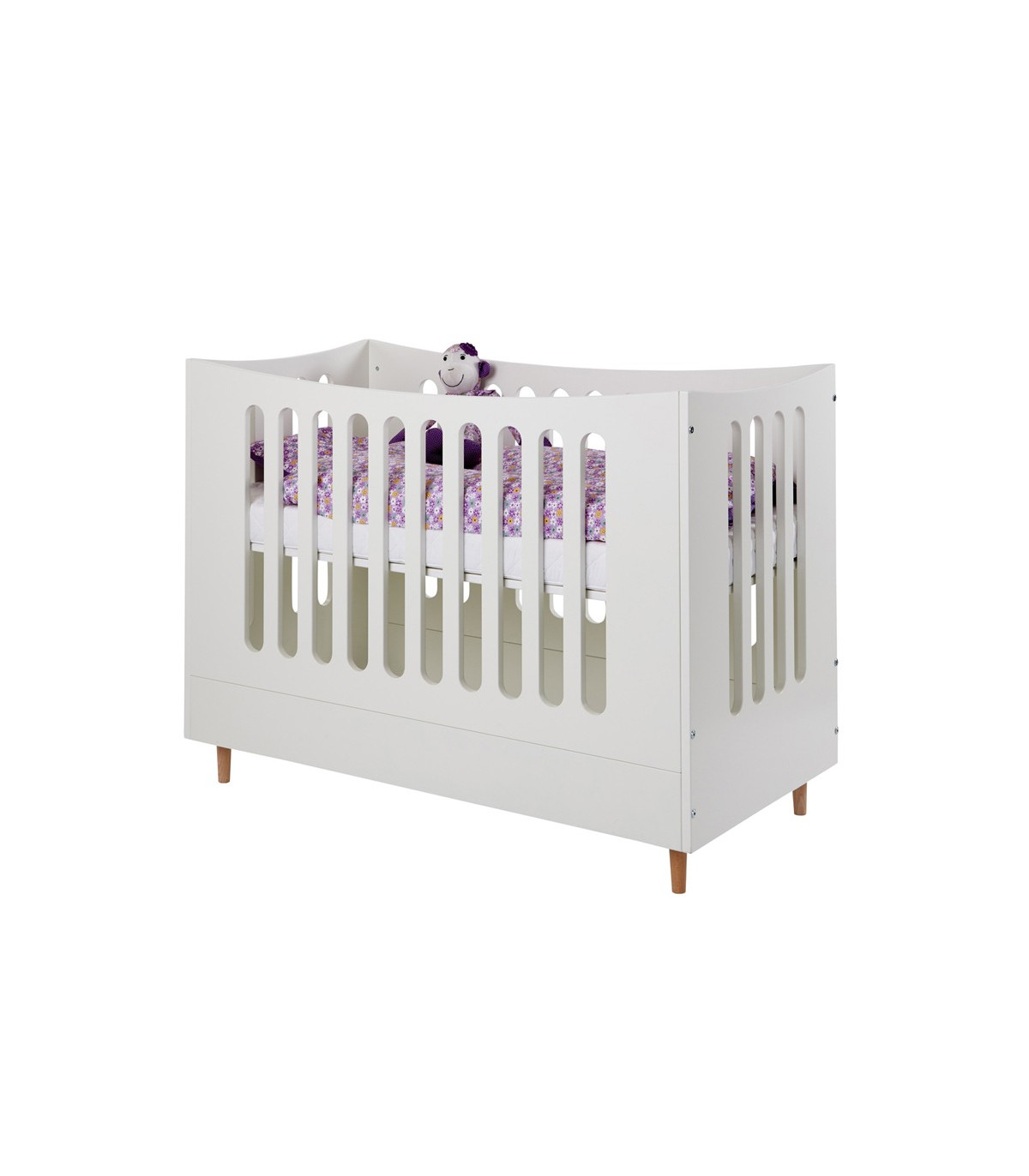 Babybett mit offenem Giebel und Buchefüssen. Höhenverstellbarer Boden (3 Höhen). Sie können das Bett zu einem Juniorbett umbauen. 60 x 120 cm. Matratze Art. 14875