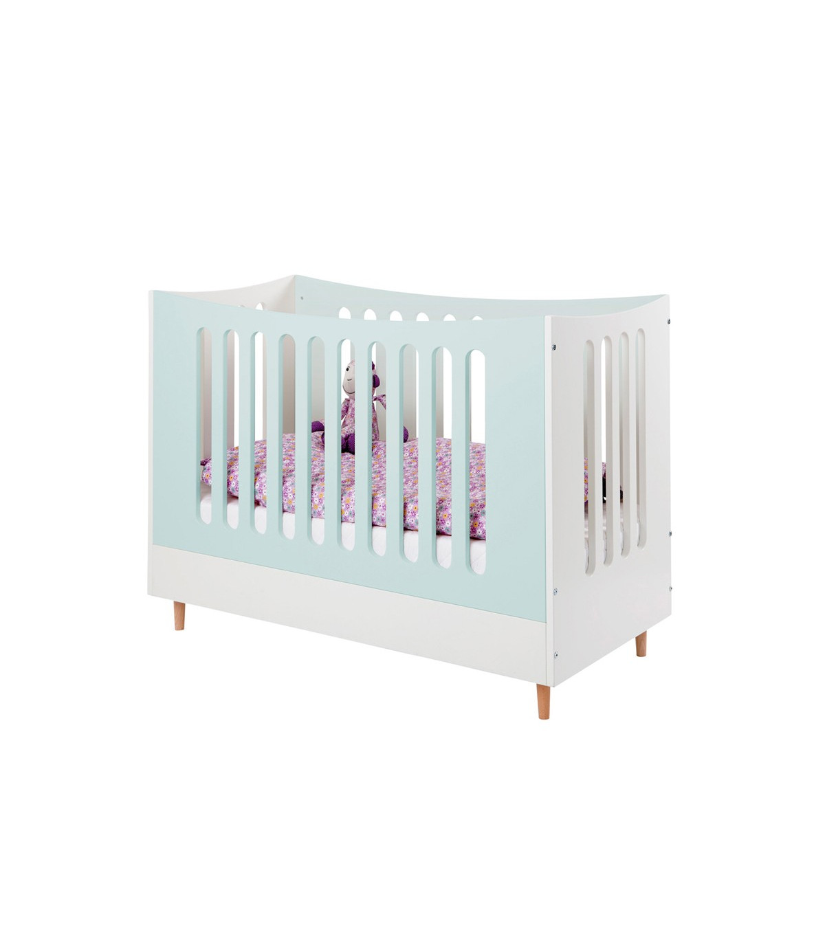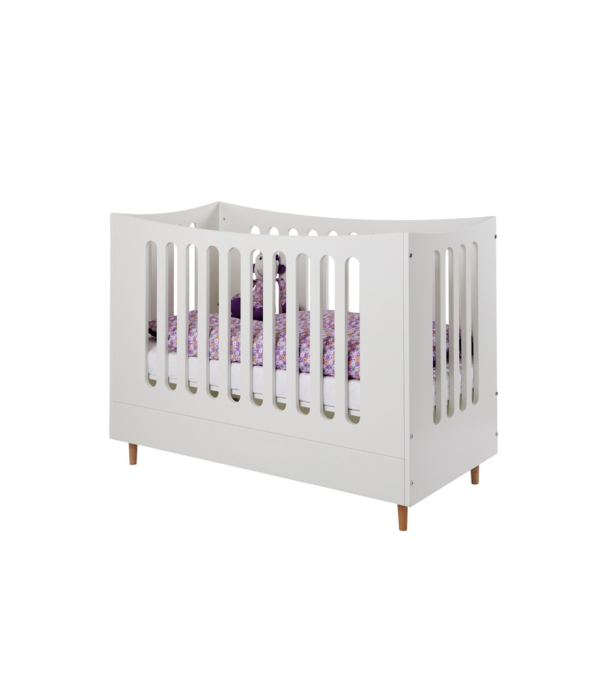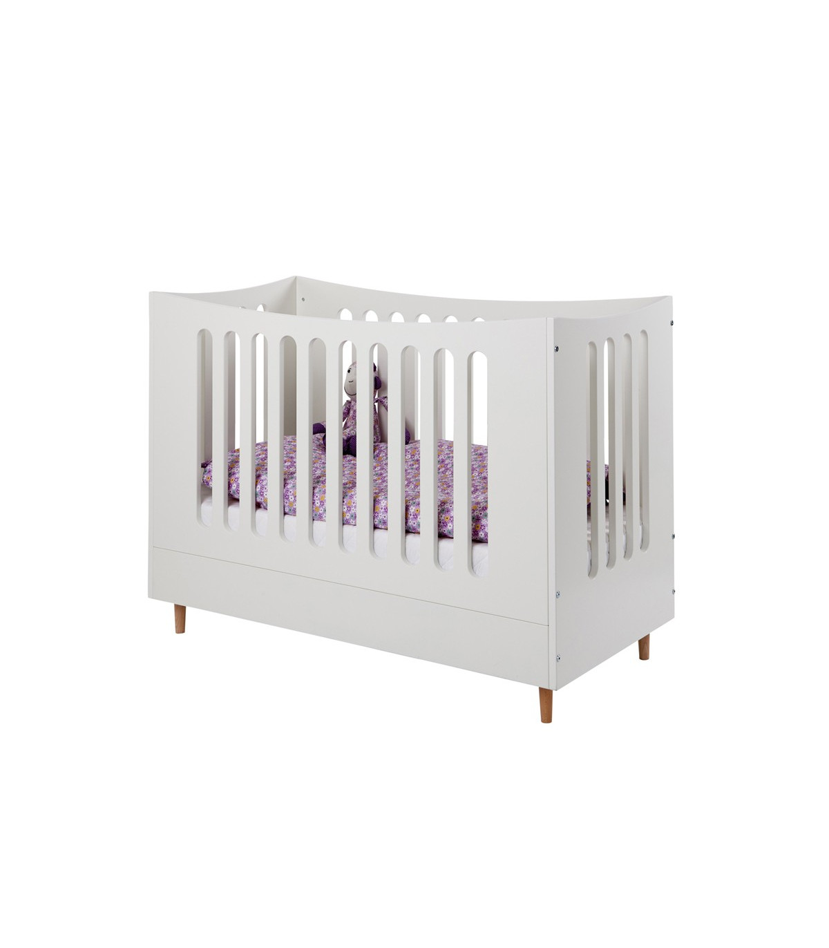 Babybett mit offenem Giebel und Buchefüssen. Höhenverstellbarer Boden (3 Höhen). Sie können das Bett zu einem Juniorbett umbauen. 60 x 120 cm. Matratze Art. 14875