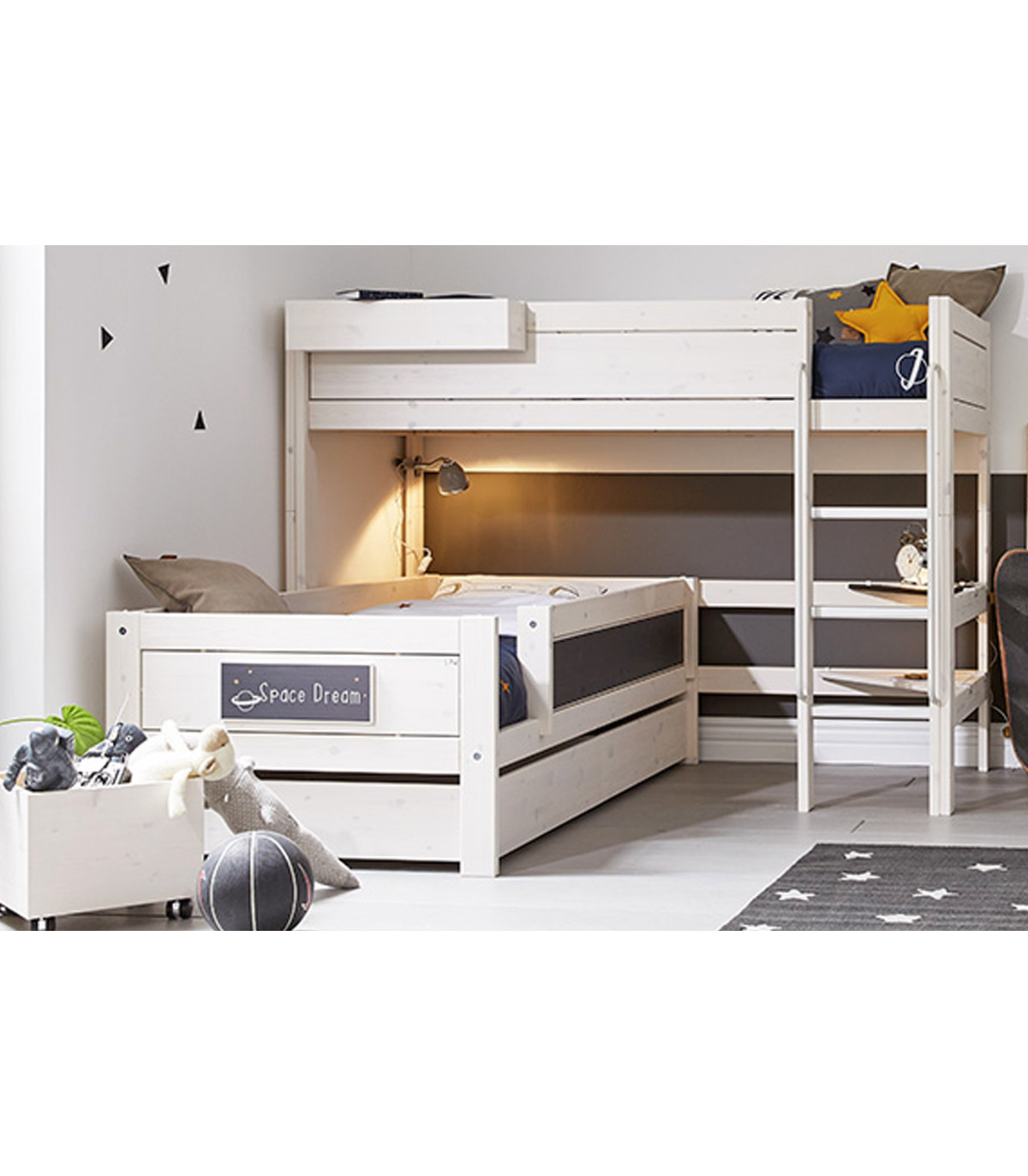 Das Low Loft Bed Corner Combi von LifeTime, wir nennen es COLIN, bietet auf kleinstem Raum komfortablen Schlafkomfort für zwei Kinder.