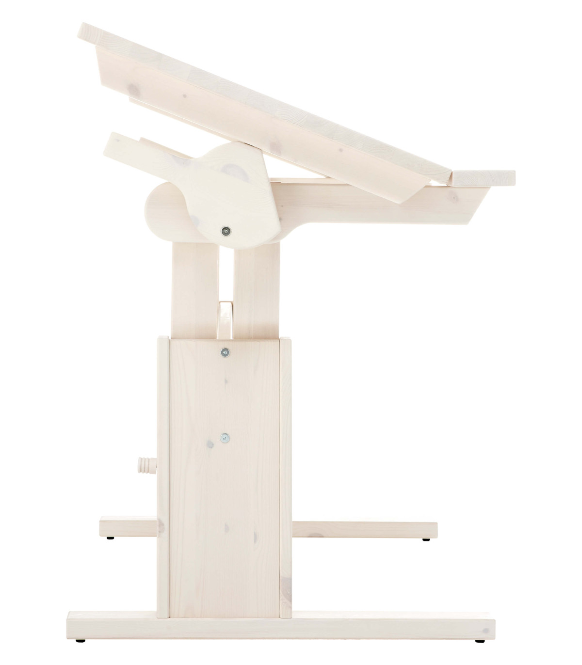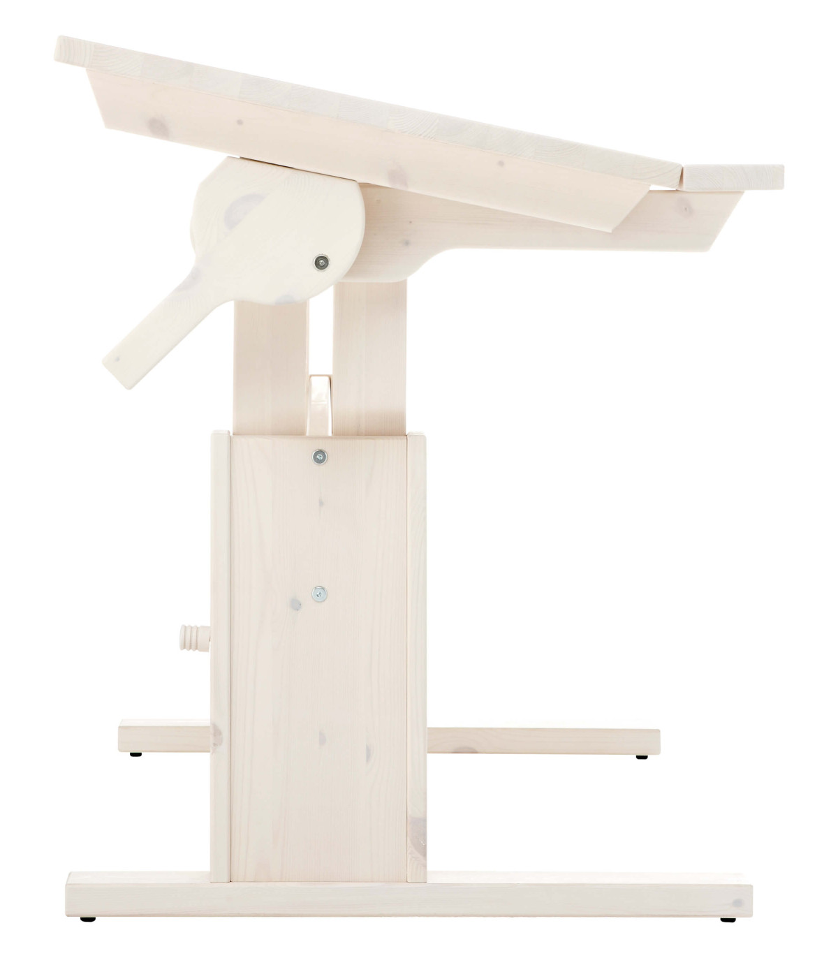 Ein massiver Holzschreibtisch, der mit dem Kind mitwächst. Die Höhe lässt sich von 56 bis 78 cm einstellen. Die Platte lässt sich ebenfalls neigbar in 0, 10 und 20 Grad verstellen, um auch ergonomisch angepasst zu werden, falls dies bevorzugt wird. Die vordere Leiste bleibt immer horizontal und ergibt beim neigen der Platte eine Kante, die Bücher und Blätter in der Position hält.