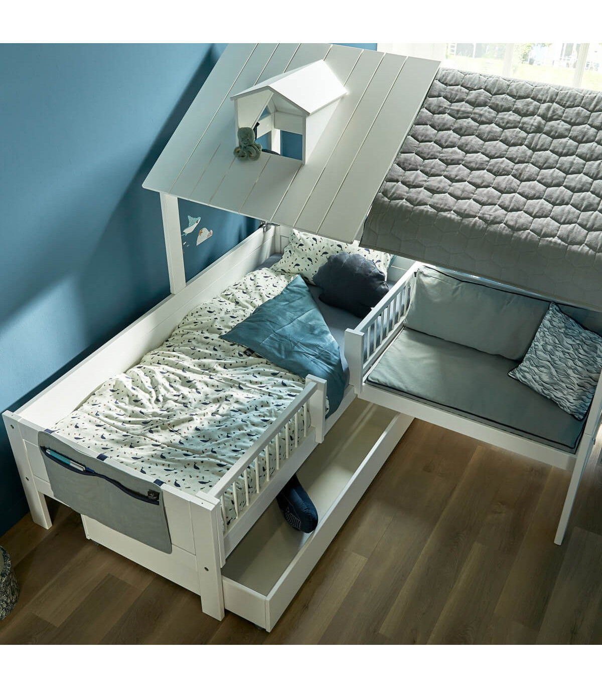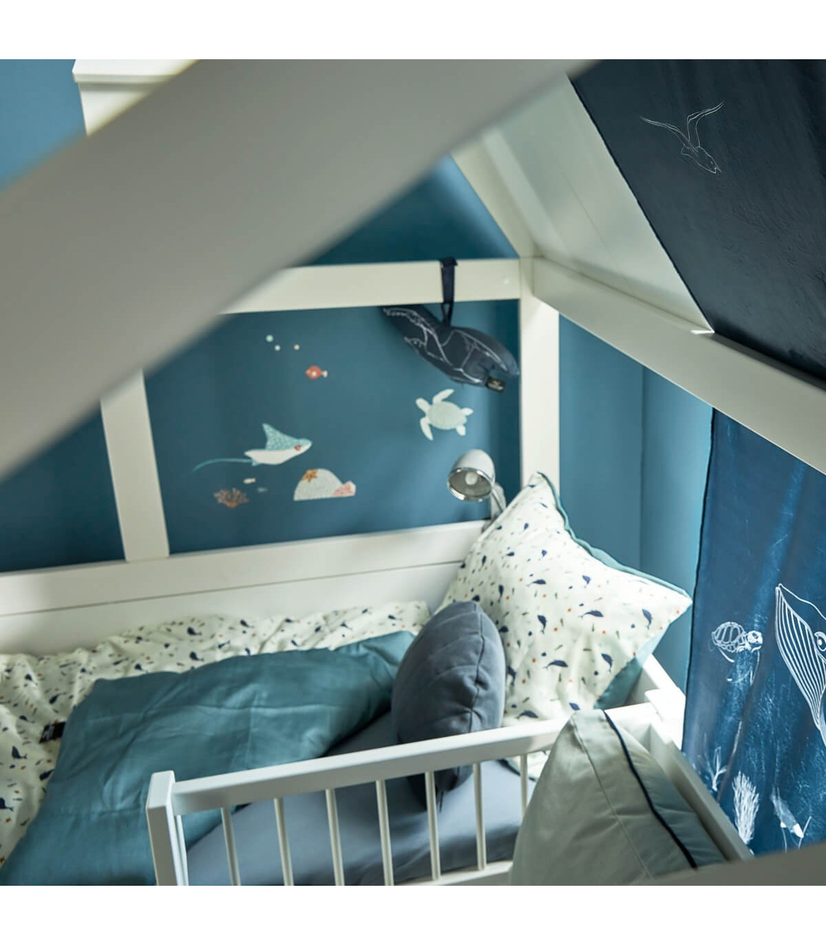 Verwenden Sie den Hausbettbezug OCEAN LIFE für Ihre Hausbettkonstruktion und schaffen Sie ein kuscheliges Schlaferlebnis. Eine Spielmöwe ist im Vorhang enthalten. Sie können den Schildkröten-Pouf oder die geformten Kissen hinzufügen, um tiefer in das Thema Ocean Life einzutauchen.