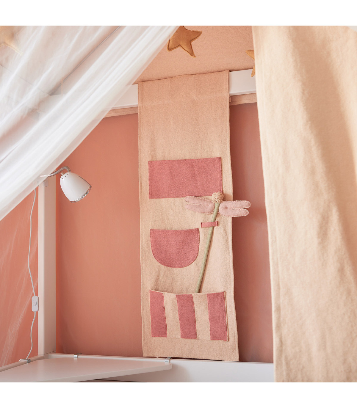 Die verspielte Aufbewahrungswand mit Taschen von Lifetime Kidsrooms ist die perfekte Ergänzung für das Kinderzimmer. Sie bietet nicht nur cleveren Stauraum in Reichweite des Bettes, sondern wird auch von einem Zauberstab in Form einer Libelle begleitet, der die Fantasie anregt. Diese Wand lässt sich ideal mit den Himmels- und Spielvorhängen aus der Kollektion Märchentheater kombinieren und schafft eine zauberhafte Atmosphäre für kleine Träumer.