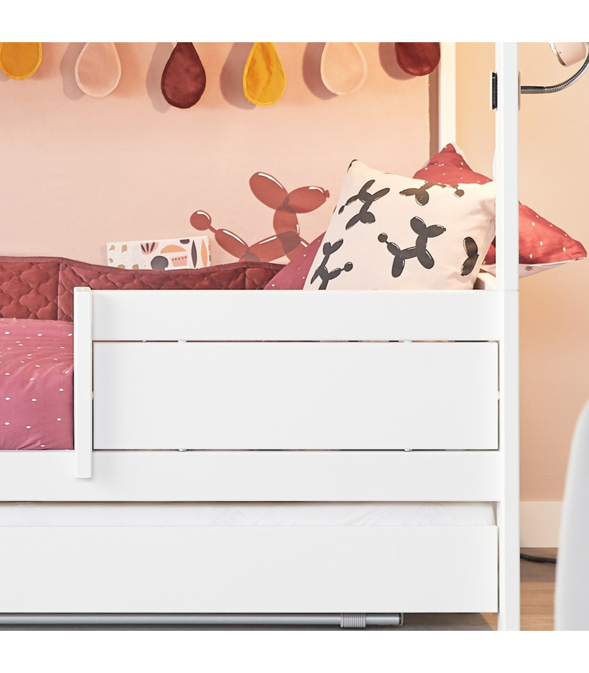 Die kurze Absturzsicherung kann an jeder Seite eines Bettes integriert werden und lässt somit einen Einstieg mittig am Bett entstehen. Diese Absturzsicherung lässt sich auf Basisbetten und Kojenbetten integrieren.