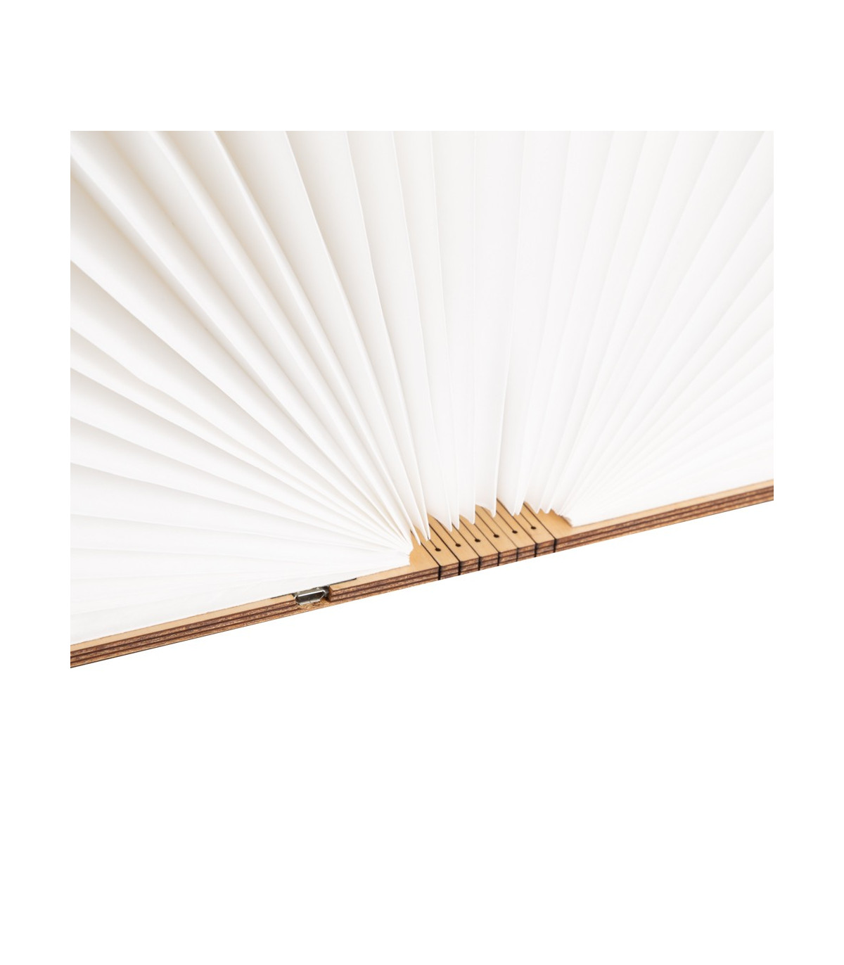 This clever book lamp turns on when you open it. Beautiful soft light shines through the bright book pages and transforms your room into a magical universe. The luminaire can be charged via USB, a USB charging cable is included.
