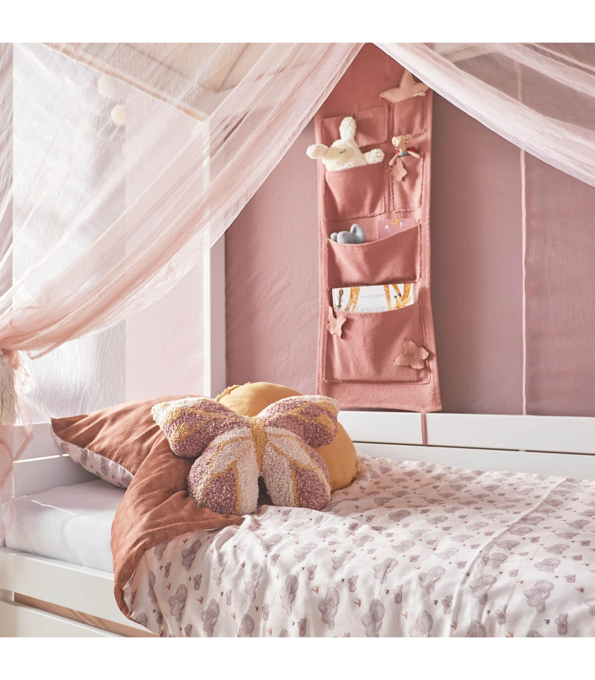 This practical back wall with pockets from the BUTTERFLIES theme can be attached to the back of your bed like a pocket hanger, art. 4634/46341 4 poster bed. So you have a clever storage space directly under the canopy. This article was designed in collaboration with Lorena Canals, the inventor of the concept of washable carpets. Made from 100% natural cotton and dyes to ensure durability after washing, comfort and safety every day.
