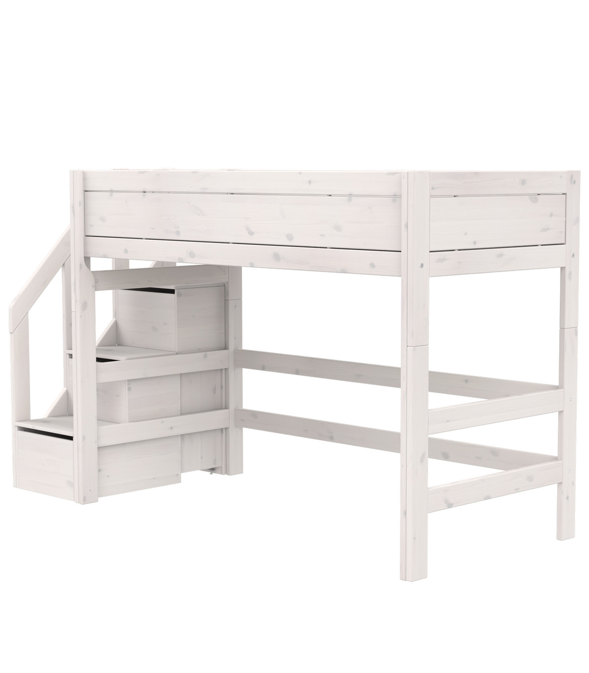 A medium loft bed is slightly higher than the half-height bed, but still at a height that is easy to reach, also make for bedding. The stairs on the side can be mounted on the left or right and, in addition to a place for climbing up, also provide plenty of storage space.