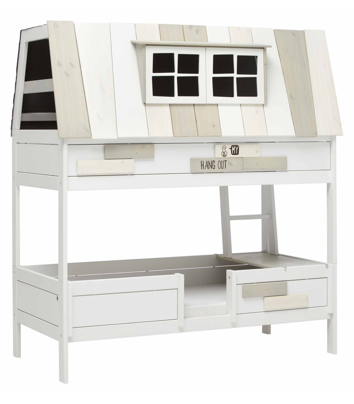 Distance between beds: 87 cm / Roof panels of HANGOUT are always in mixed colors / top and back of roof = anthracite cotton fabric / ladder can be mounted left or right of the bed.