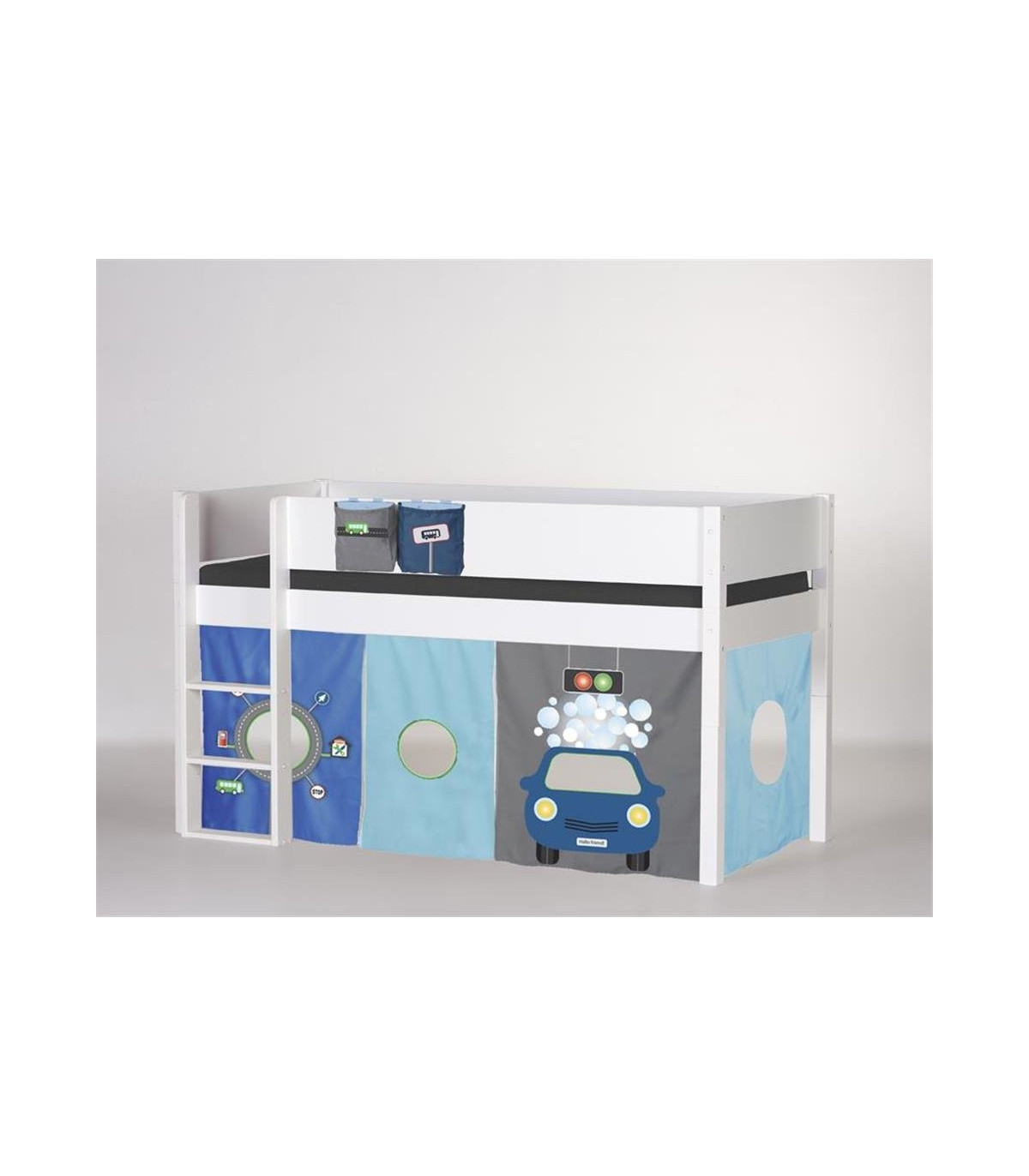 Curtains in combination of blue and gray tones more "car parts" are removable and can be moved. The interactive part is to move the lights of the car or change the road signs.