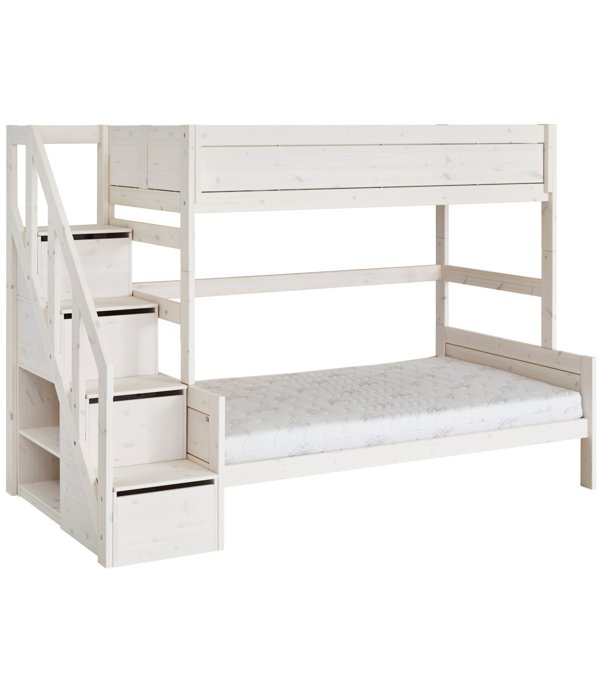The classic bunk bed provides sleeping space for 2 people, as you know it. Here the lower bed is a bit bigger. The stairs on the side can be mounted on the left or right and, in addition to a place for climbing up, also provide plenty of storage space.