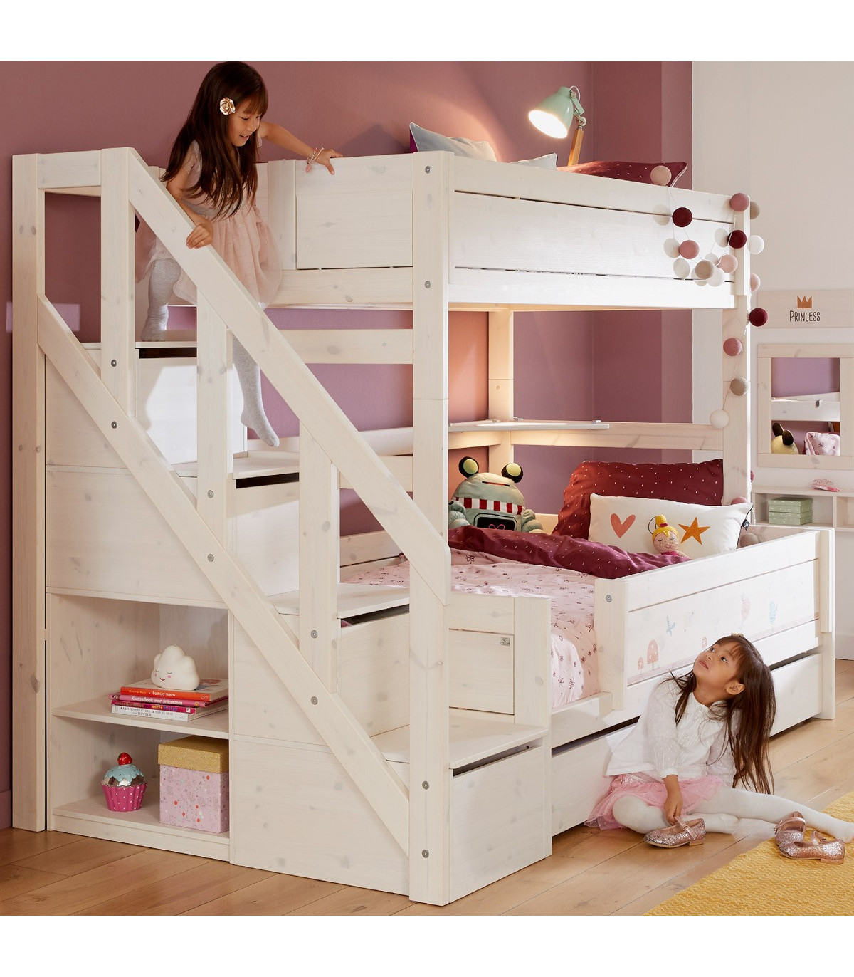 The classic bunk bed provides sleeping space for 2 people, as you know it. Here the lower and upper bed is slightly larger. The stairs on the side can be mounted on the left or right and, in addition to a place for climbing up, also provide plenty of storage space.
