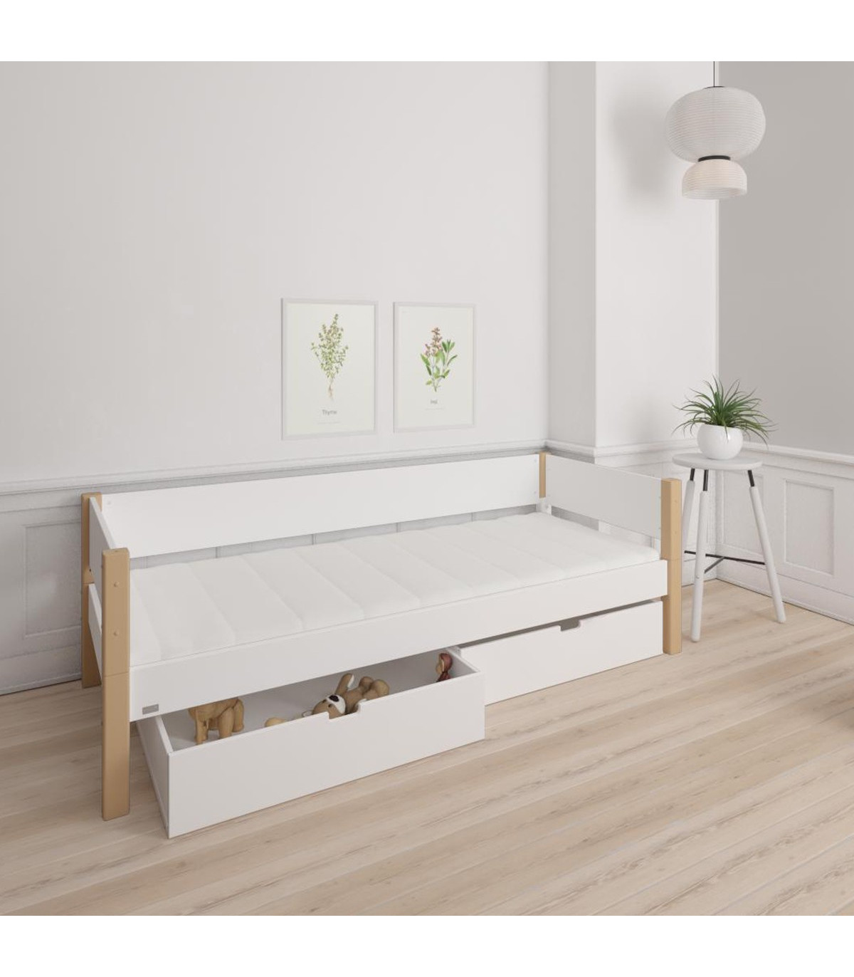 Manis-h SIF cot 90x200 cm with fall protection and 2 drawers Snow white with beech post
