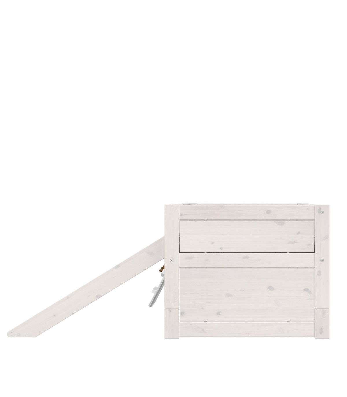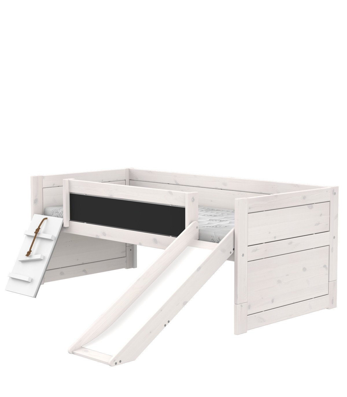 The bunk bed is slightly raised with a base and thus offers more possibilities under the bed. Here, the bed has been equipped with slide, running plank and fall protection with chalkboard and offers the slightly younger child playful development possibilities. The lying height is about 53 cm still at a height that is easily accessible and can still be mastered by a younger child. For more safety, attachable fall protection systems can also be easily integrated. On the bed there is also room for a roof construction and turns the bed into a cool hut.
