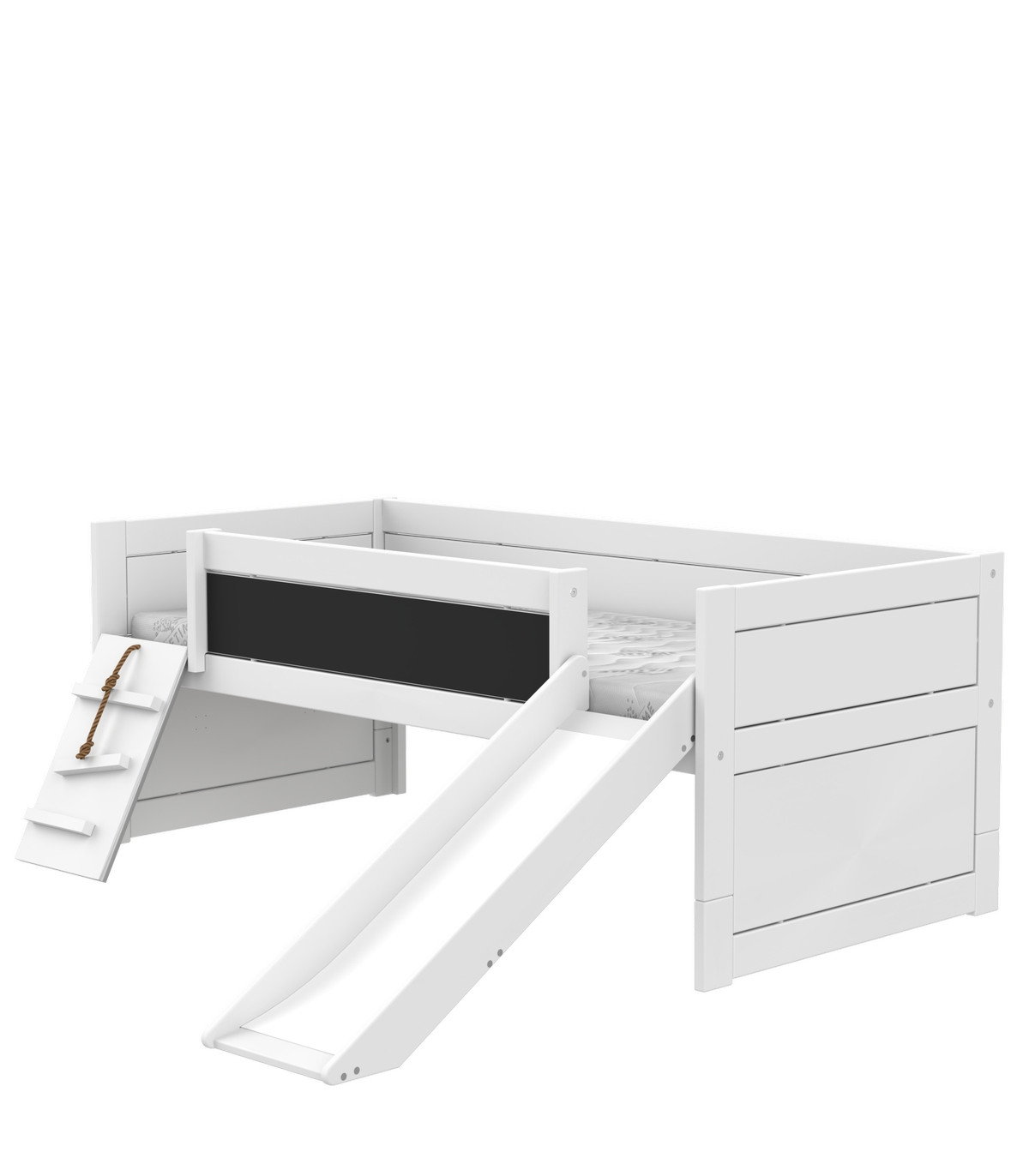 The bunk bed is slightly raised with a base and thus offers more possibilities under the bed. Here, the bed has been equipped with slide, running plank and fall protection with chalkboard and offers the slightly younger child playful development possibilities. The lying height is about 53 cm still at a height that is easily accessible and can still be mastered by a younger child. For more safety, attachable fall protection systems can also be easily integrated. On the bed there is also room for a roof construction and turns the bed into a cool hut.