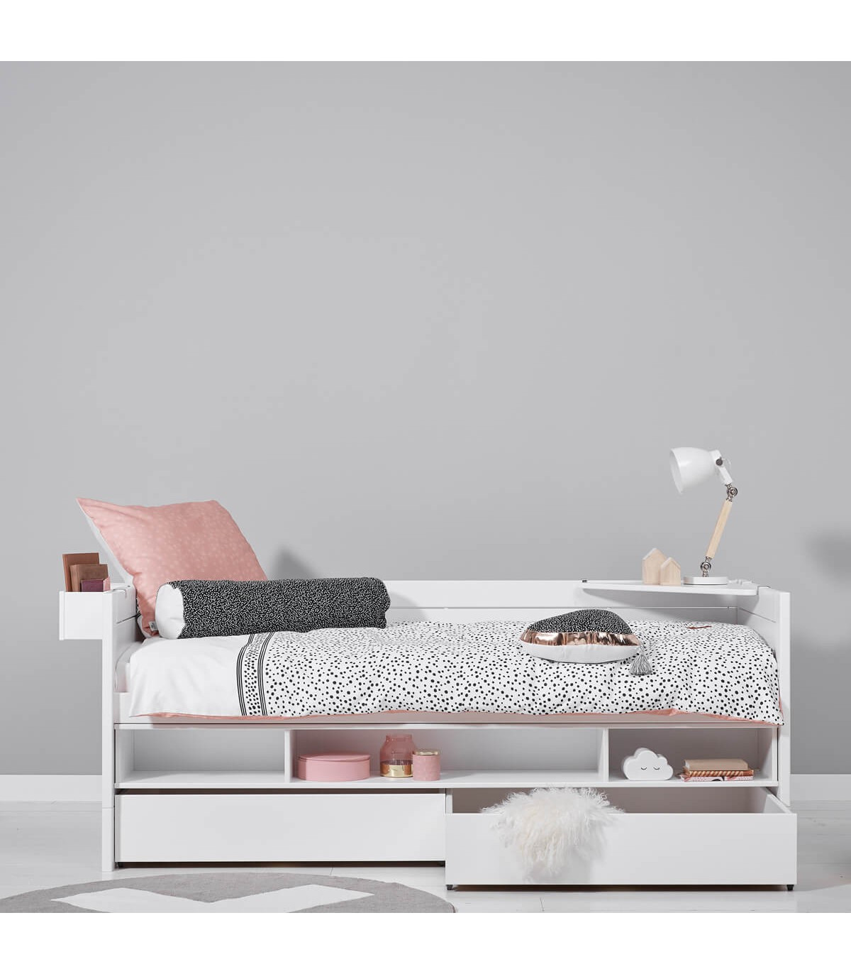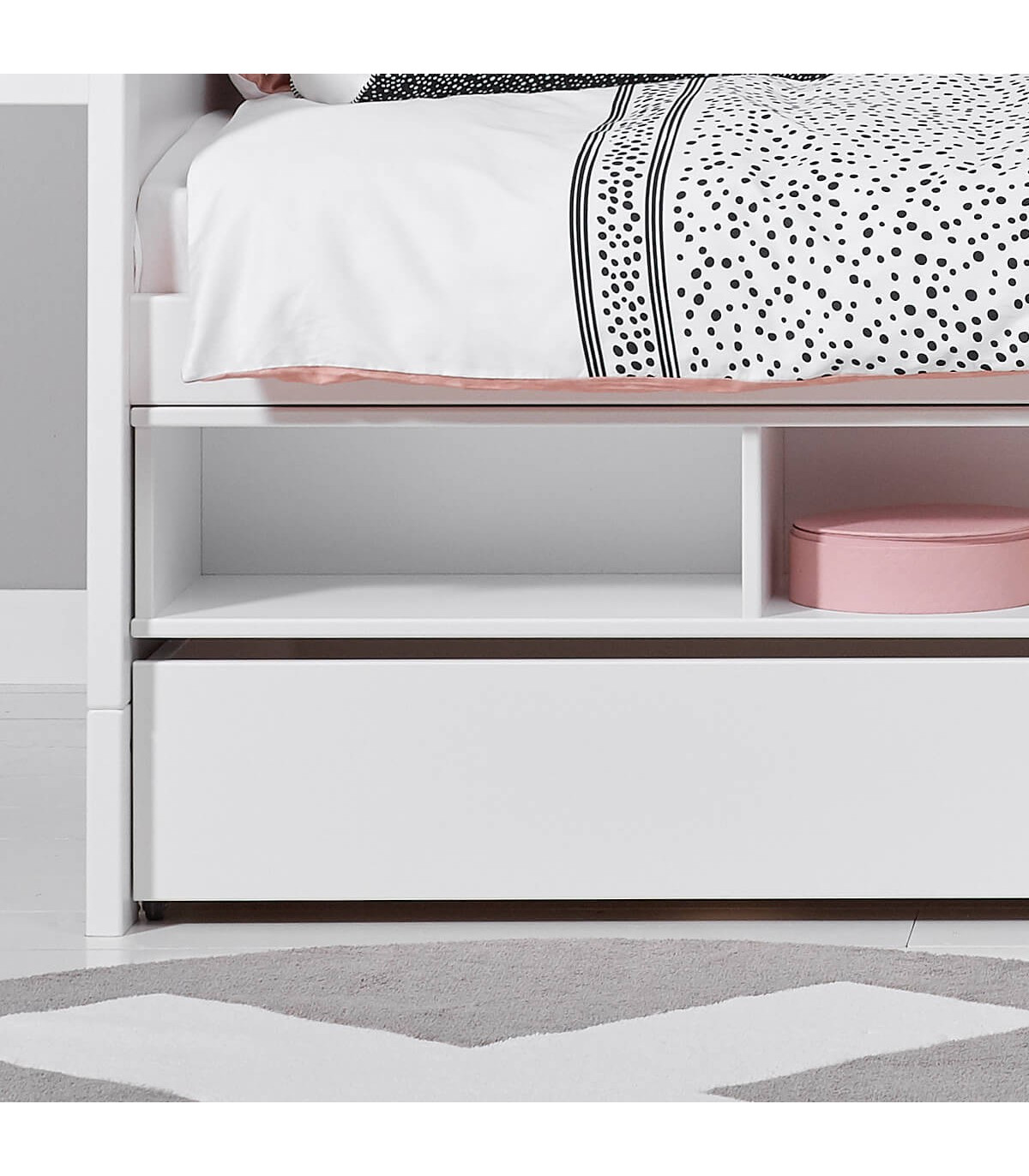 The bunk bed is ideal if you want to have further options for storage space or guest bed solutions at a low sleeping height. In the area under the bed there is enough space for placing 3 shelves art. 8005, which can be equipped with doors or pushers or for the guest bed solution with bed box art. 7040 + 7042. Another option is to place the running plank and slide with fall protection in between. Art. 174 + 172 + 4621. If you want a roof or a sky above the bed, this is also possible here.