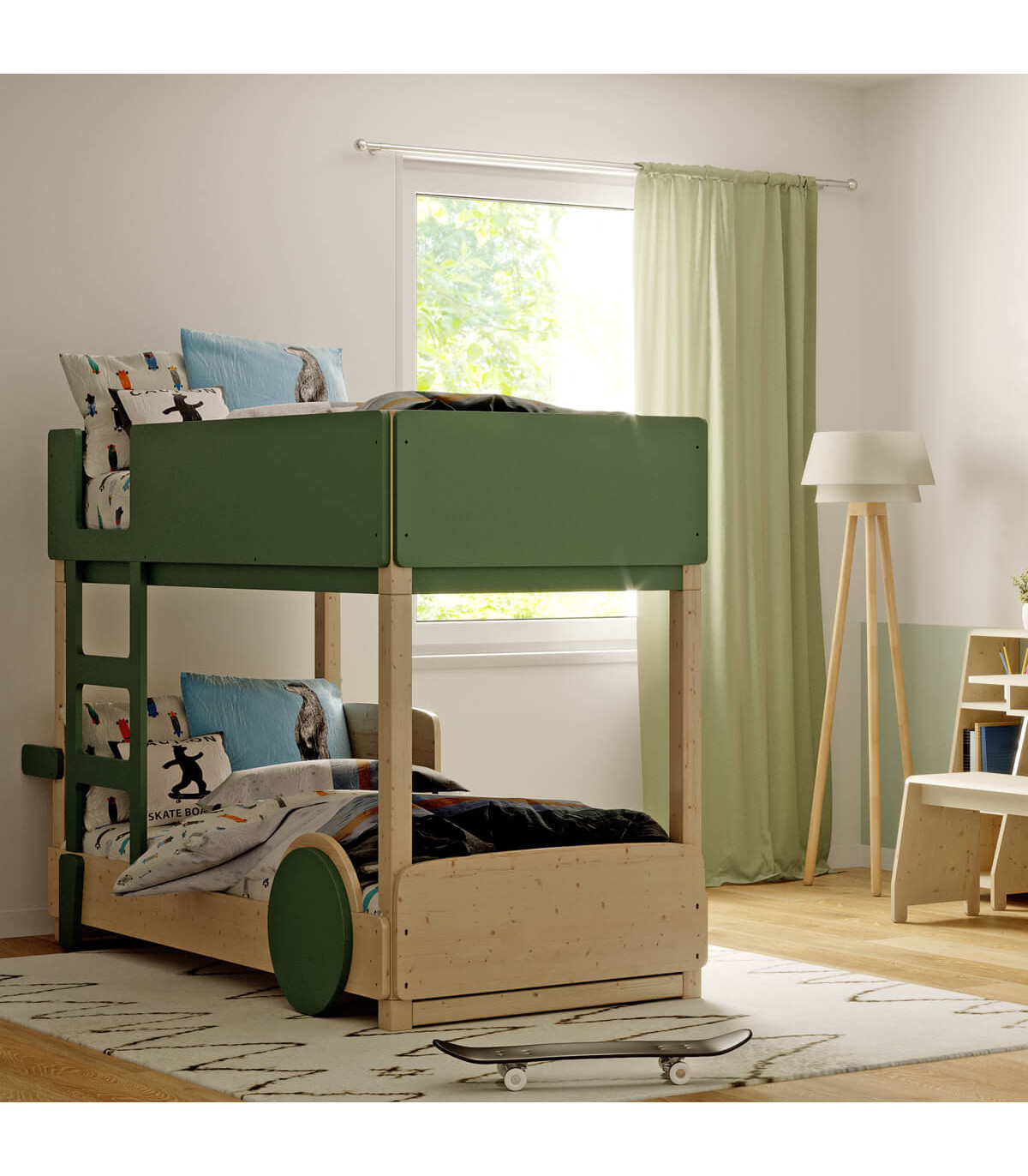 The bed is mainly composed of solid pine wood with MDF elements added. The woods are PEFC registered. It is available in natural varnish and 27 water based lacquers. It is also available in natural wood in order to paint it yourself.