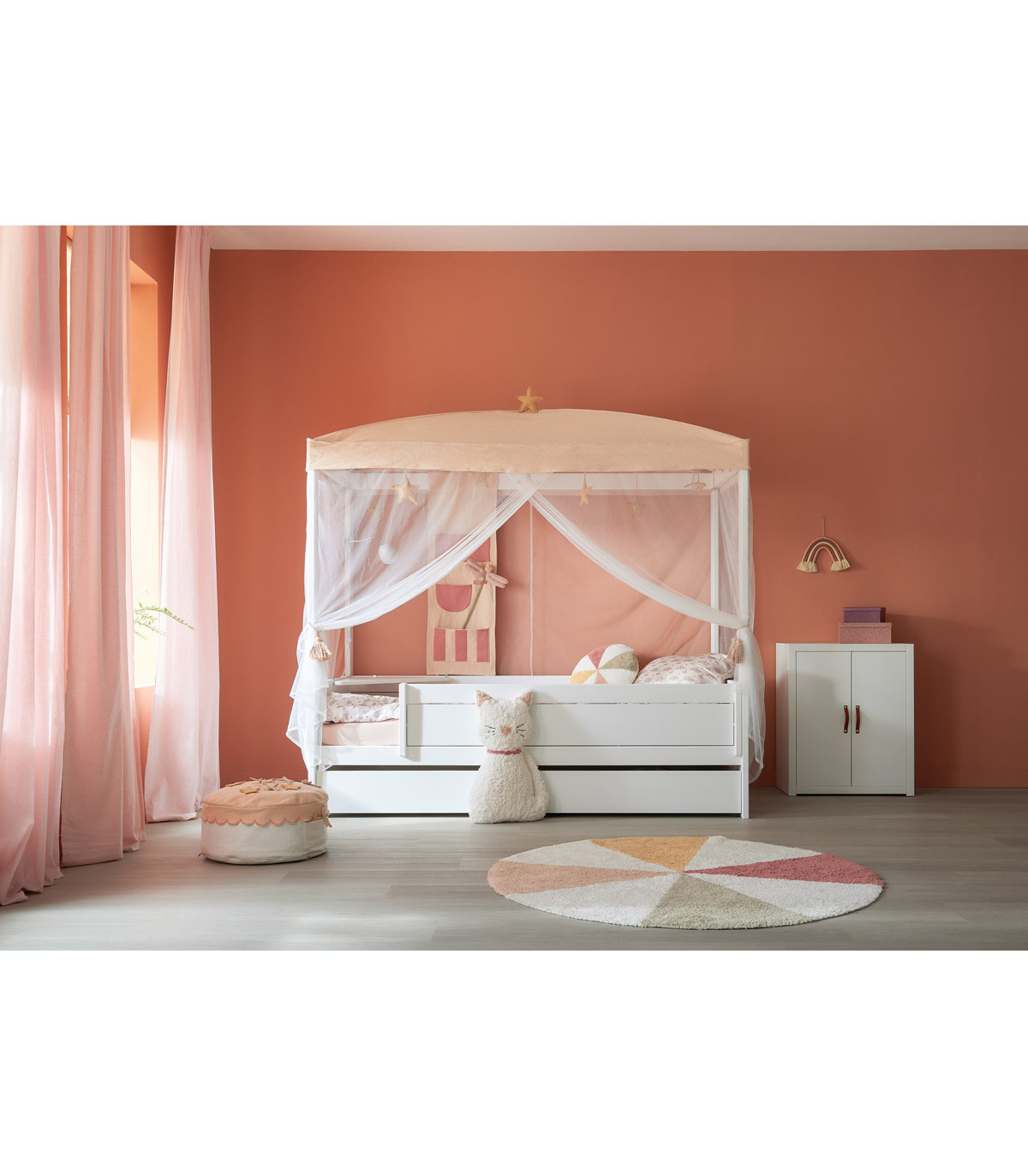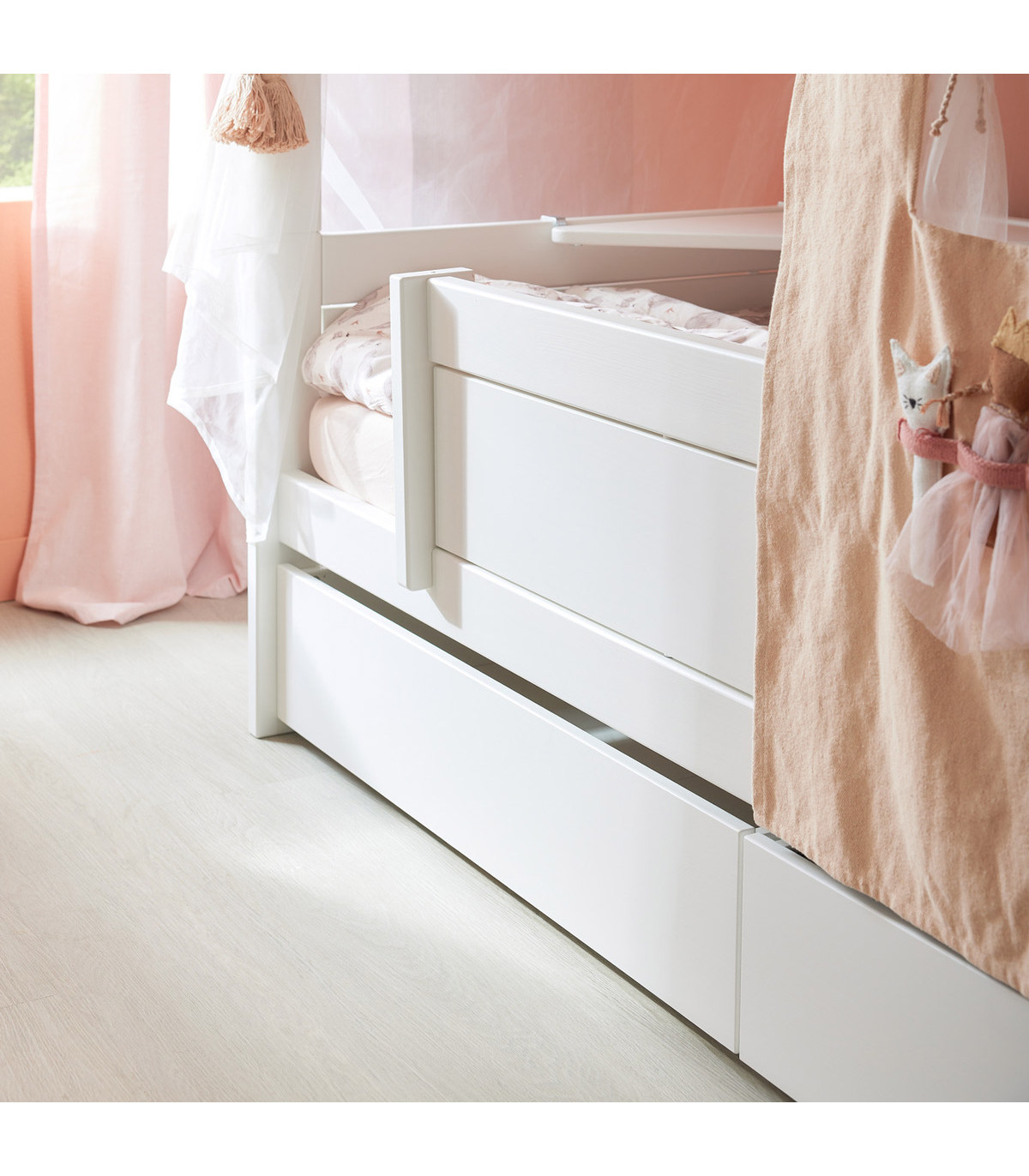 The beautiful "Fairy Theatre" canopy transforms the bed into a magical oasis. Equipped with a star topper and decorative star and dragonfly hangings, it creates a whimsical atmosphere. The canopy was designed in collaboration with Lorena Canals and is made from high-quality, natural cotton fabric combined with lightweight mesh. This way, the bed becomes not just a sleeping place but also a playground for creative adventures.
