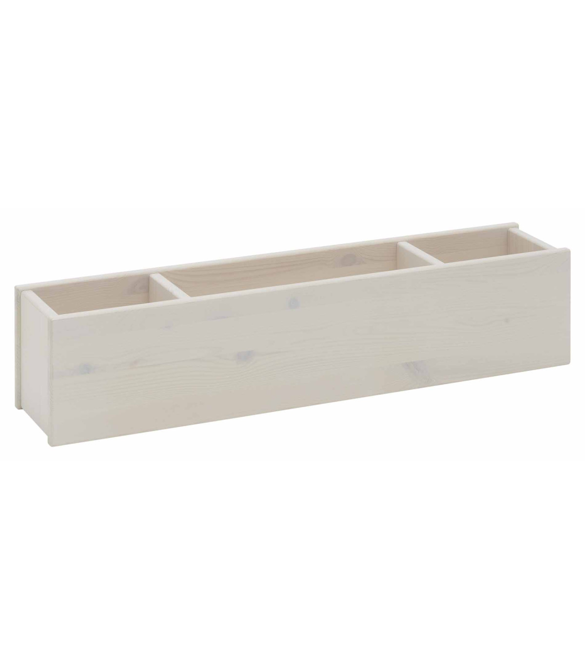 La boîte suspendue peut être fixée au lit presque n’importe où et offre ainsi une place pour les jouets, les livres, etc. La boîte est divisée en 3 compartiments et dispose d’un dispositif qui permet également le montage sur le mur avec les compartiments orientés vers l’avant. Le raccord est doublé de feutre et protège la surface du lit.