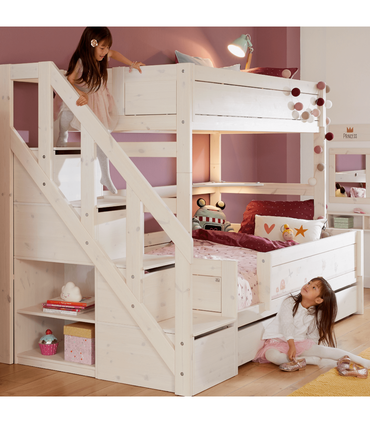 Le lit superposé classique offre un espace de couchage pour 2 personnes, comme vous le savez. Ici, le lit inférieur est un peu plus grand. Les escaliers sur le côté peuvent être montés à gauche ou à droite et, en plus d’un endroit pour monter, offrent également beaucoup d’espace de rangement.