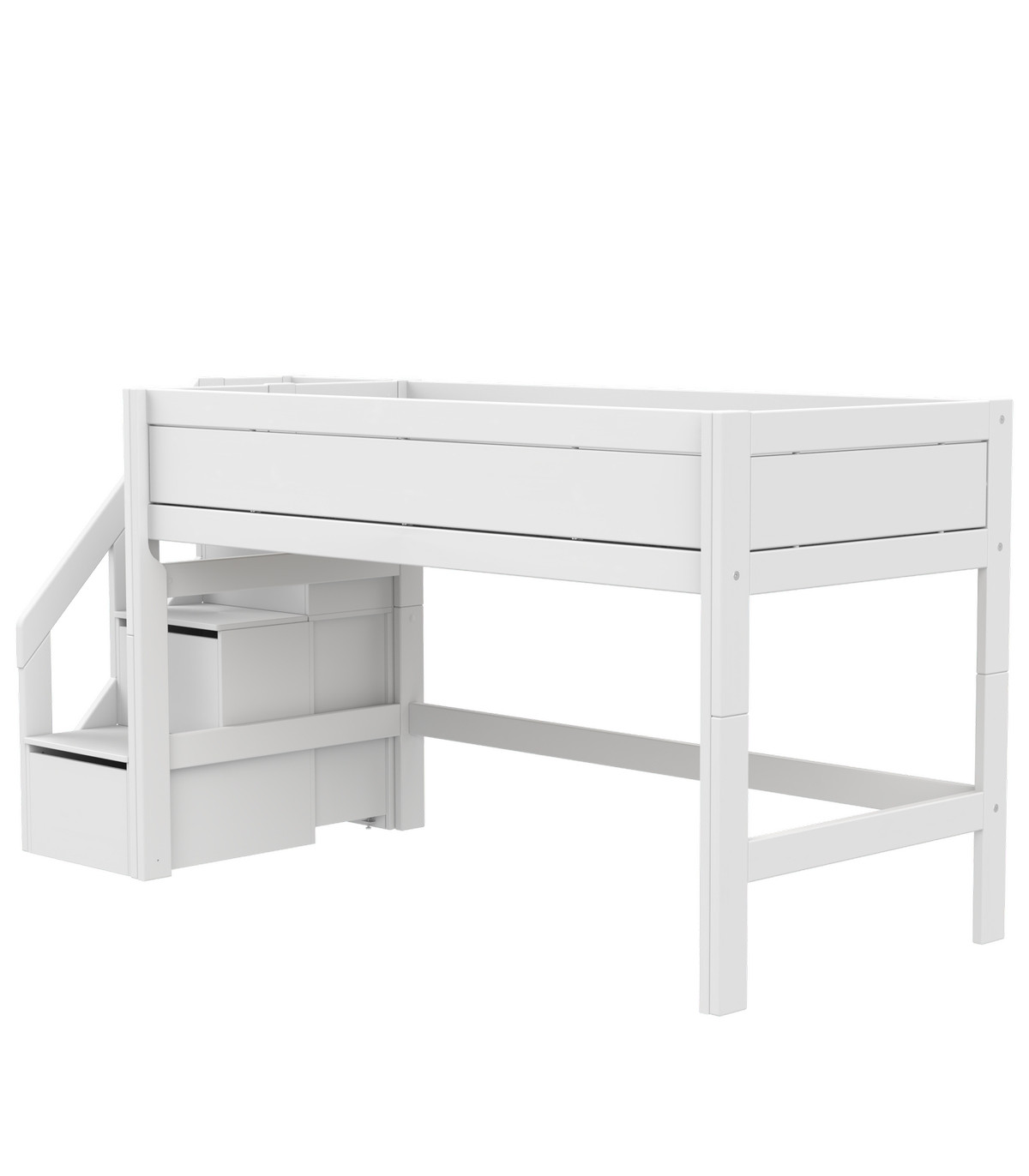 Découvrez notre lit mi-haut polyvalent avec escalier latéral, qui s'adapte idéalement aux besoins de votre enfant ! Ce lit innovant combine une montée sûre et facile avec un espace de rangement intelligent et offre en même temps une merveilleuse zone de jeu sous le lit.