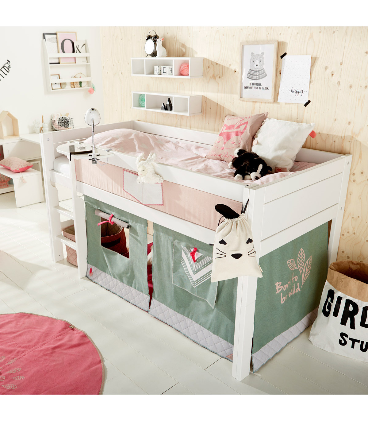 Le lit demi-mezzanine assure suffisamment de jeu et de plaisir. Quel enfant ne veut pas dormir dans un lit surélevé et vivre des aventures passionnantes et imaginatives? À cette fin, il existe différents rideaux de jeu, qui peuvent être facilement placés sous le lit demi-mezzanine. Un toboggan art. 172 avec ou sans en combinaison avec une tour Art. 170 fournit un mouvement et une action supplémentaires dans la chambre des enfants. Plus tard, le lit peut être facilement converti pour d’autres besoins tels que les devoirs avec d’autres parties. Un lit bébé frais pour une chambre d’enfant fraîche.