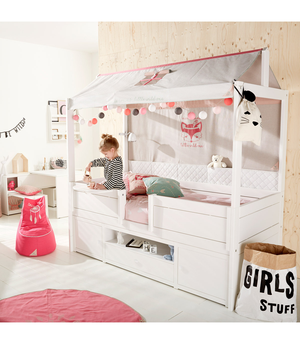 Le lit superposé est légèrement surélevé avec une base et offre ainsi plus de possibilités sous le lit. Ici, la chambre a été remplie d’un lit d’invité gigogne et d’une boîte de lit en dessous. La hauteur de couchage d’environ 53 cm est toujours à une hauteur facilement accessible et peut encore être maîtrisée par un enfant plus jeune. Pour plus de sécurité, les systèmes de protection contre les chutes attachables peuvent également être facilement intégrés. En option, la boîte de lit peut également être convertie en lit d’invité avec l’ensemble d’extension art. 151. Ainsi, vous auriez rangé 3 zones de couchage sur 2 mètres carrés et créé un lieu de couchage pour les amis de nuit en quelques secondes. Sur le lit, il y a aussi de la place pour une construction de toit et transforme le lit en une cabane fraîche.