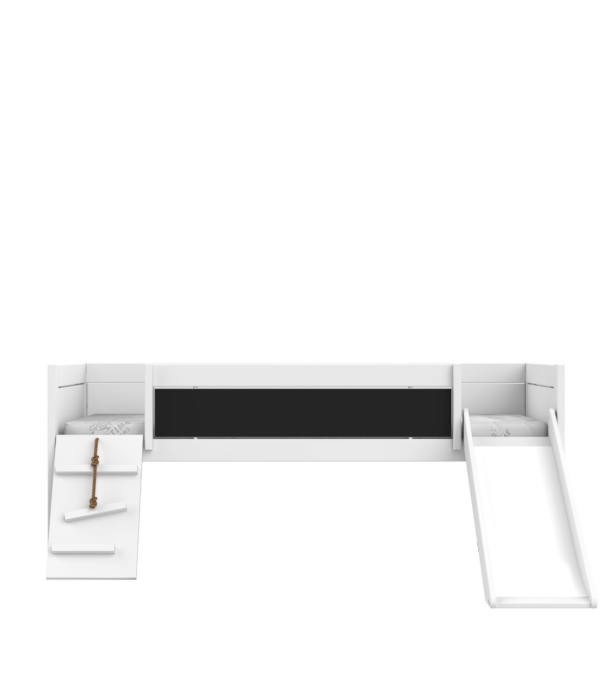 Le lit superposé est légèrement surélevé avec une base et offre ainsi plus de possibilités sous le lit. Ici, le lit a été équipé d’un toboggan, d’une planche de course et d’une protection contre les chutes au tableau et offre à l’enfant un peu plus jeune des possibilités de développement ludique. La hauteur de couchage est d’environ 53 cm encore à une hauteur facilement accessible et peut encore être maîtrisée par un enfant plus jeune. Pour plus de sécurité, les systèmes de protection contre les chutes attachables peuvent également être facilement intégrés. Sur le lit, il y a aussi de la place pour une construction de toit et transforme le lit en une cabane fraîche.