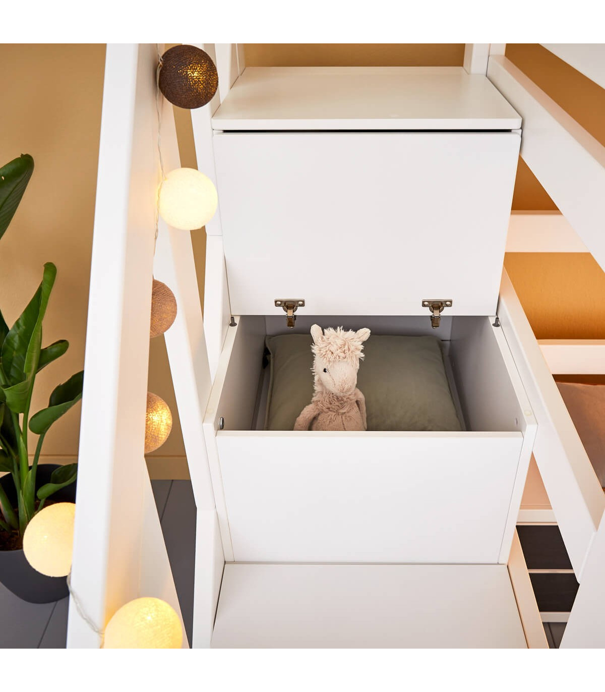 Un lit mezzanine offre l’espace le plus large possible sous un lit. Ici, une grande plaque d’écriture, un lit sujet à position transversale peuvent également trouver une place. Les escaliers sur le côté peuvent être montés à gauche ou à droite et, en plus d’un endroit pour monter, offrent également beaucoup d’espace de rangement.