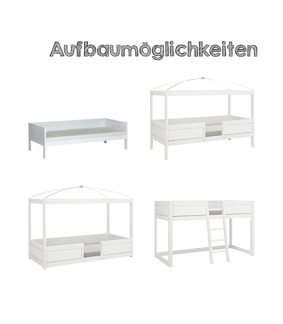 Le lit 4-en-1 est un concept où vous pouvez installer le lit avec toutes les parties en 4 versions différentes, adaptant ainsi l’enfant du jeune âge au jeune adolescence. Version 1: Lit avec toit en tissu et surface de couchage près du sol. Version 2: Lit avec surface de couchage à hauteur normale et avec toit en tissu. Version 3: Lit à mi-hauteur où la structure du toit a été convertie en base. Des échelles et des dispositifs de protection contre les chutes sont déjà disponibles dans le lit 4 en 1. Version 4: Un lit simple ou un canapé lorsque l’enfant n’a besoin que d’un lit normal.