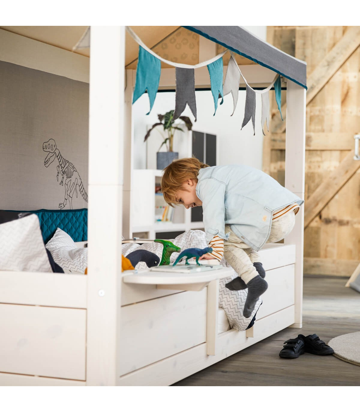 Le lit 4-en-1 est un concept où vous pouvez installer le lit avec toutes les parties en 4 versions différentes, adaptant ainsi l’enfant du jeune âge au jeune adolescence. Version 1: Lit avec toit en tissu et surface de couchage près du sol. Version 2: Lit avec surface de couchage à hauteur normale et avec toit en tissu. Version 3: Lit à mi-hauteur où la structure du toit a été convertie en base. Des échelles et des dispositifs de protection contre les chutes sont déjà disponibles dans le lit 4 en 1. Version 4: Un lit simple ou un canapé lorsque l’enfant n’a besoin que d’un lit normal.
