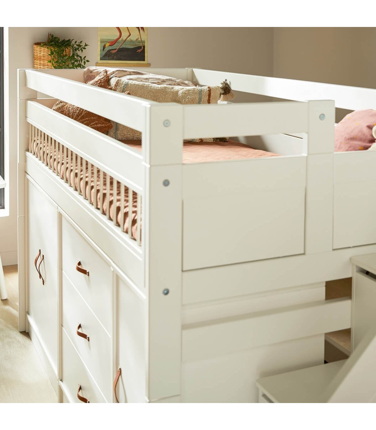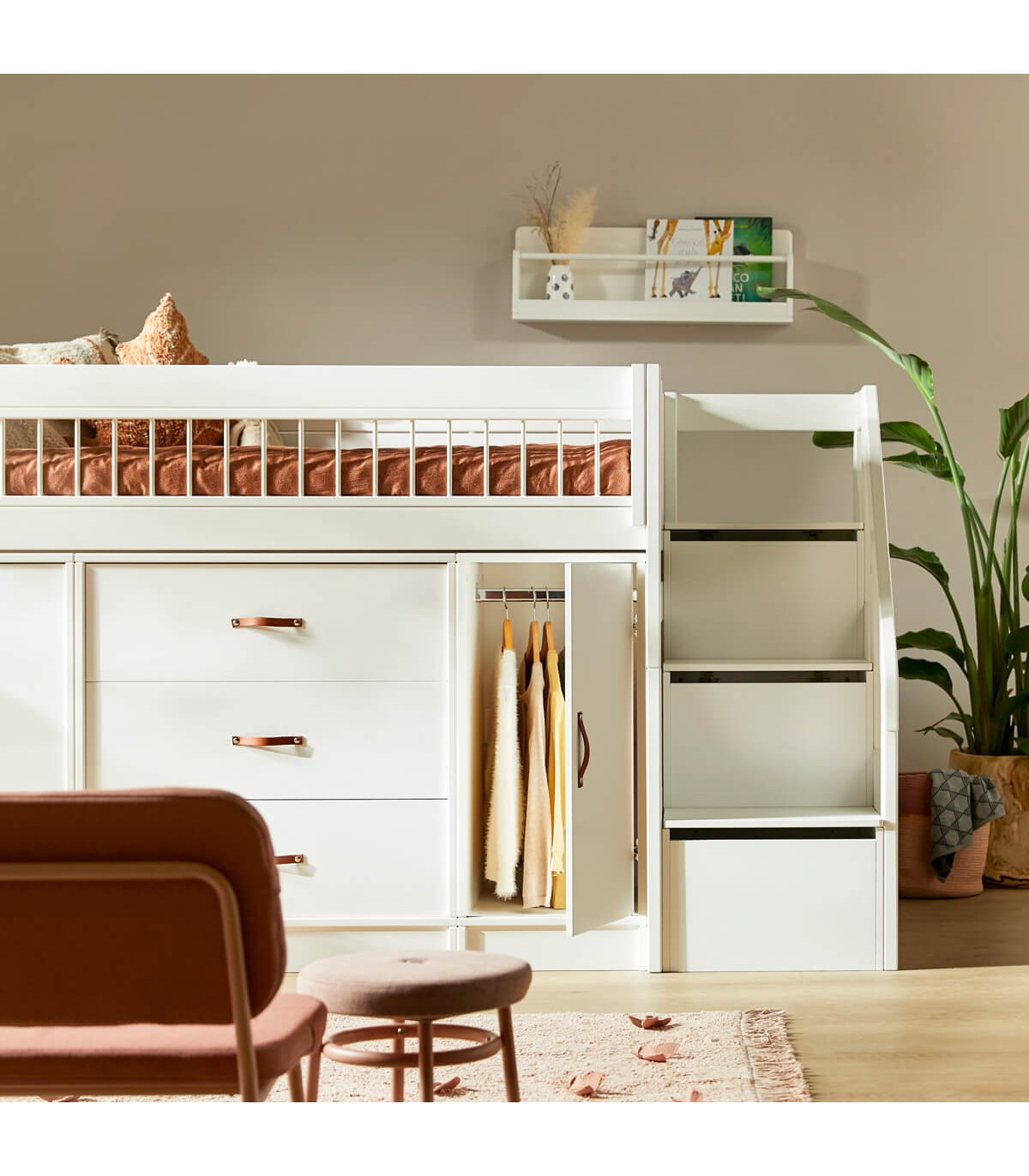 Cette combinaison de lit rend inutile une armoire supplémentaire, car votre enfant peut facilement accéder à ses vêtements grâce à la hauteur adaptée aux enfants des modules. C'est la solution idéale : un espace de couchage sûr en haut, protégé par des bords de lit solides, un rangement astucieux dans les marches de l'échelle et la possibilité pour les enfants de pratiquer leur autonomie en accédant de manière indépendante à leurs vêtements et jouets.