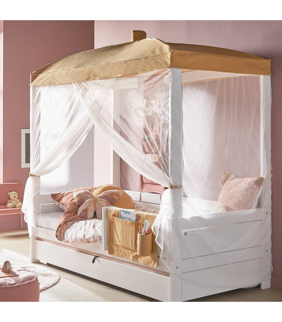 Lit bébé de base Lifetime Honey Glow avec ciel et cadre à lattes de luxe, 120x200 cm COMBI blanc