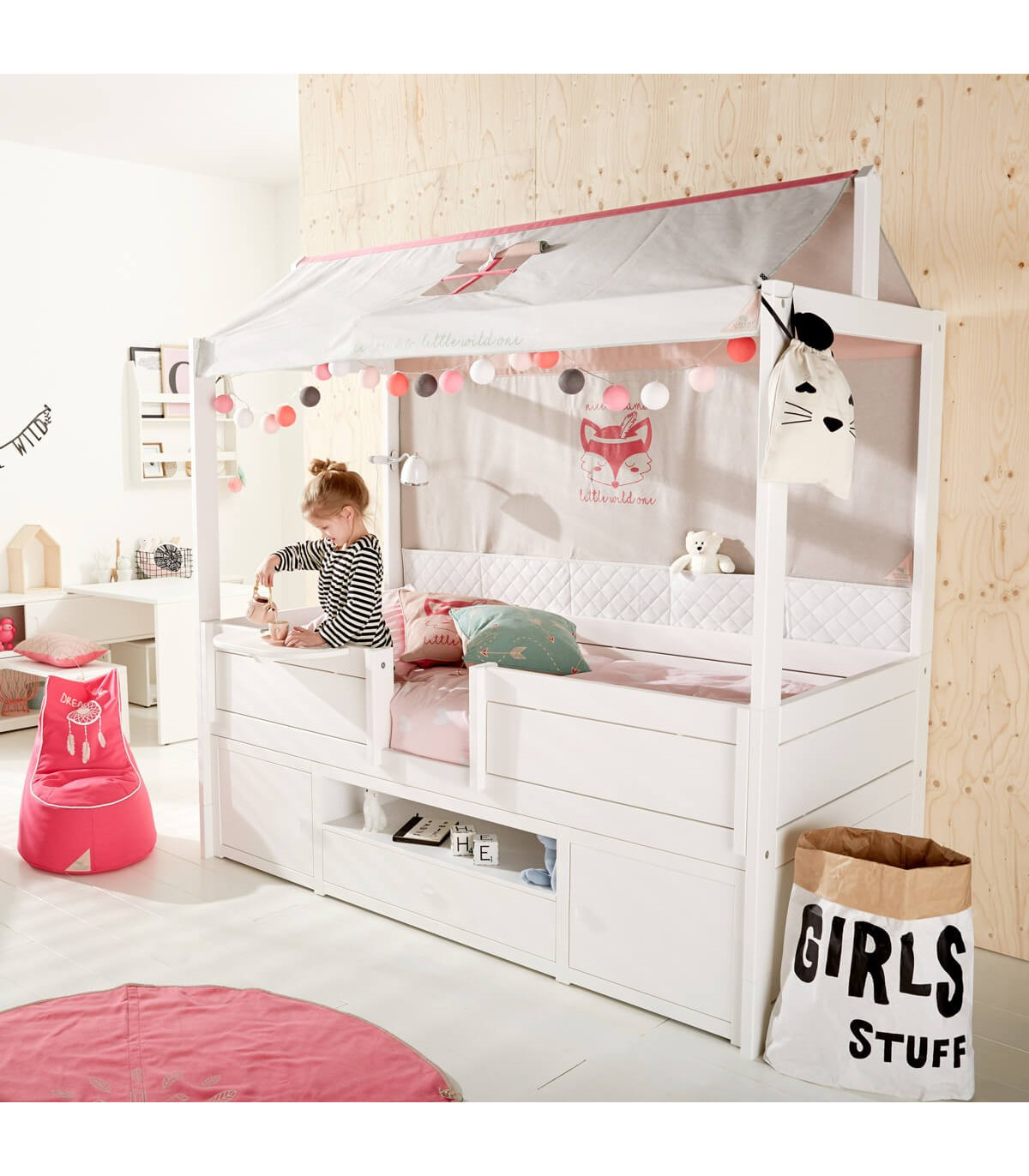 La collection Wild Child comprend le mur arrière en tissu, qui peut être très bien intégré dans le toit en tissu. Celui-ci contient plusieurs poches dans lesquelles les livres préférés et les petits animaux en peluche peuvent être bien rangés. Idéal pour le lit 4 en 1 ou le lit de base avec construction de toit Art. 6371.