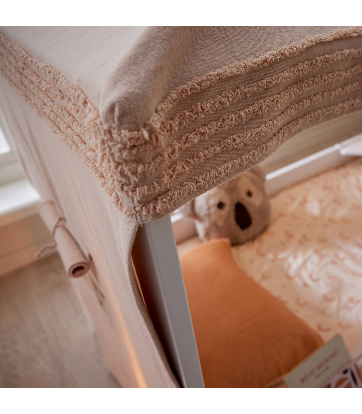 Le baldaquin est disponible en deux couleurs différentes : naturel et pêche. Il est fabriqué à 100 % en coton recyclable.