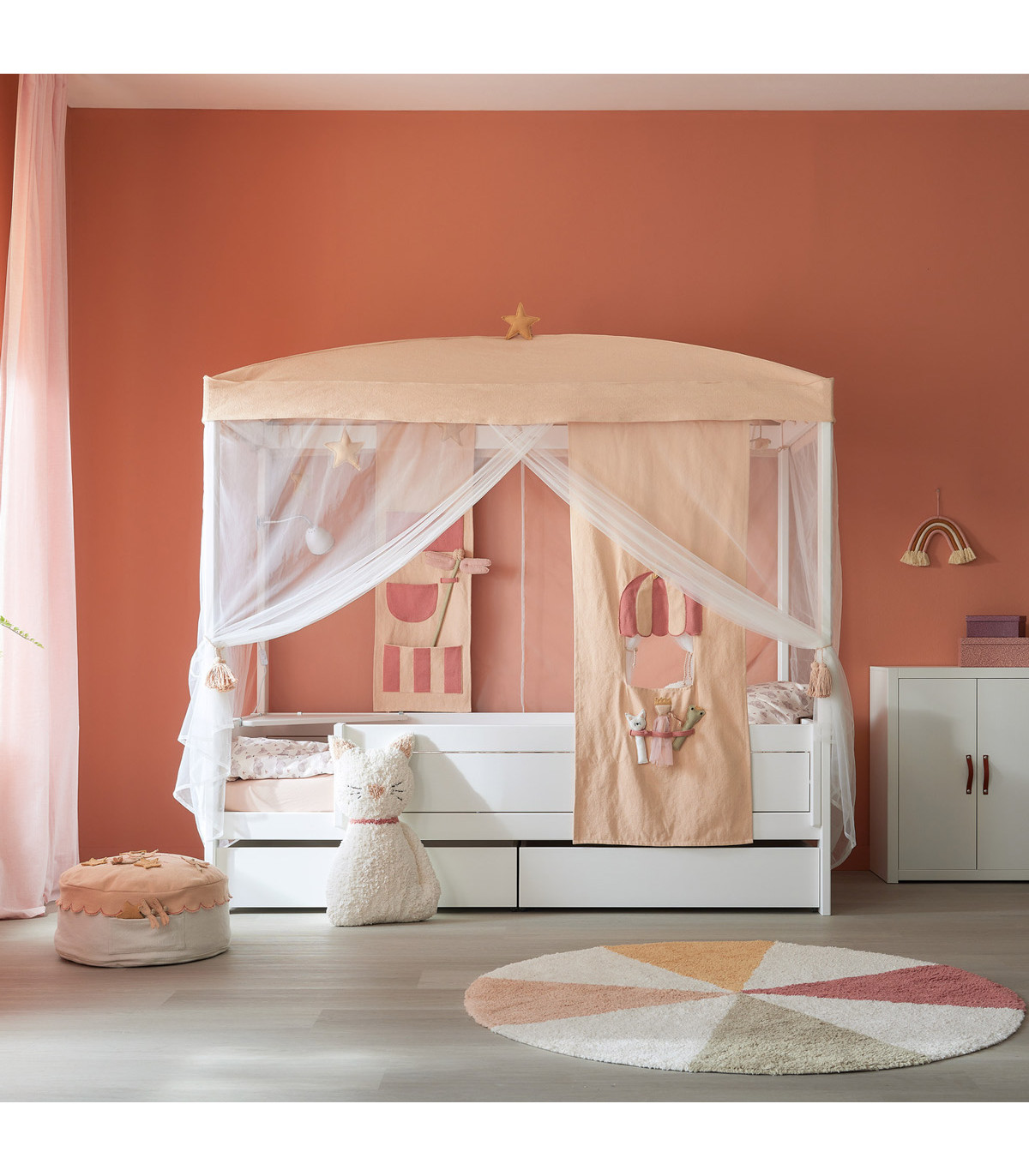 Le magnifique voile « Théâtre des Fées » de Lifetime Kidsrooms transforme chaque lit en un refuge douillet et crée une atmosphère féerique pour votre enfant. Ce voile s'adapte parfaitement à notre lit à baldaquin et est fabriqué en tissu de coton naturel de haute qualité, combiné avec un fin maillage pour offrir un effet protecteur similaire à celui d'une moustiquaire.