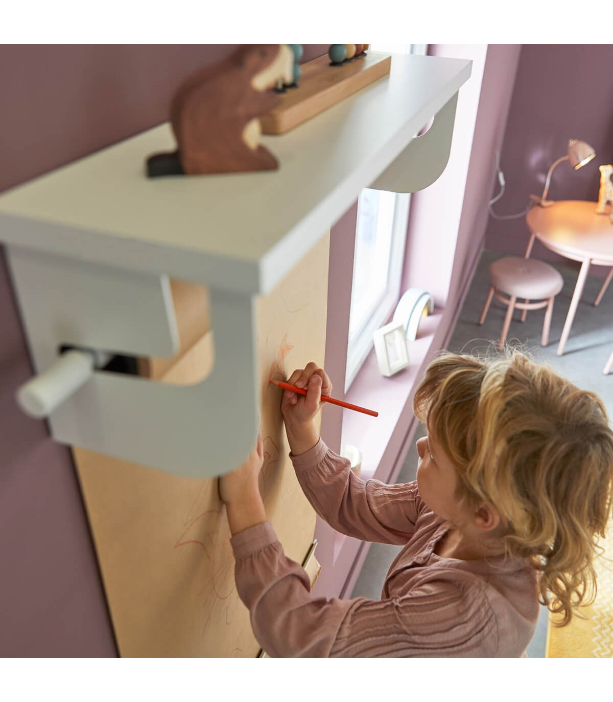 Questo rotolo di carta con ripiano può essere fissato al muro e offre 20 m di divertimento per dipingere. Strappa la carta se vuoi disegnare qualcosa di nuovo o prendere appunti. Il rotolo di carta può essere sostituito. La carta kraft è fatta di carta riciclata.
